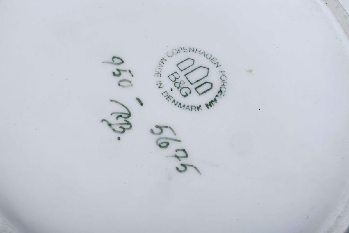Porcellana policroma. Marca: simbolo della fabbrica con tre torri, “B&G COPENHAGEN PORCELAIN MADE IN DENMARK”, numeri e lettere diversi, in verde. Altezza cm 23,2. Conservazione: ottima
