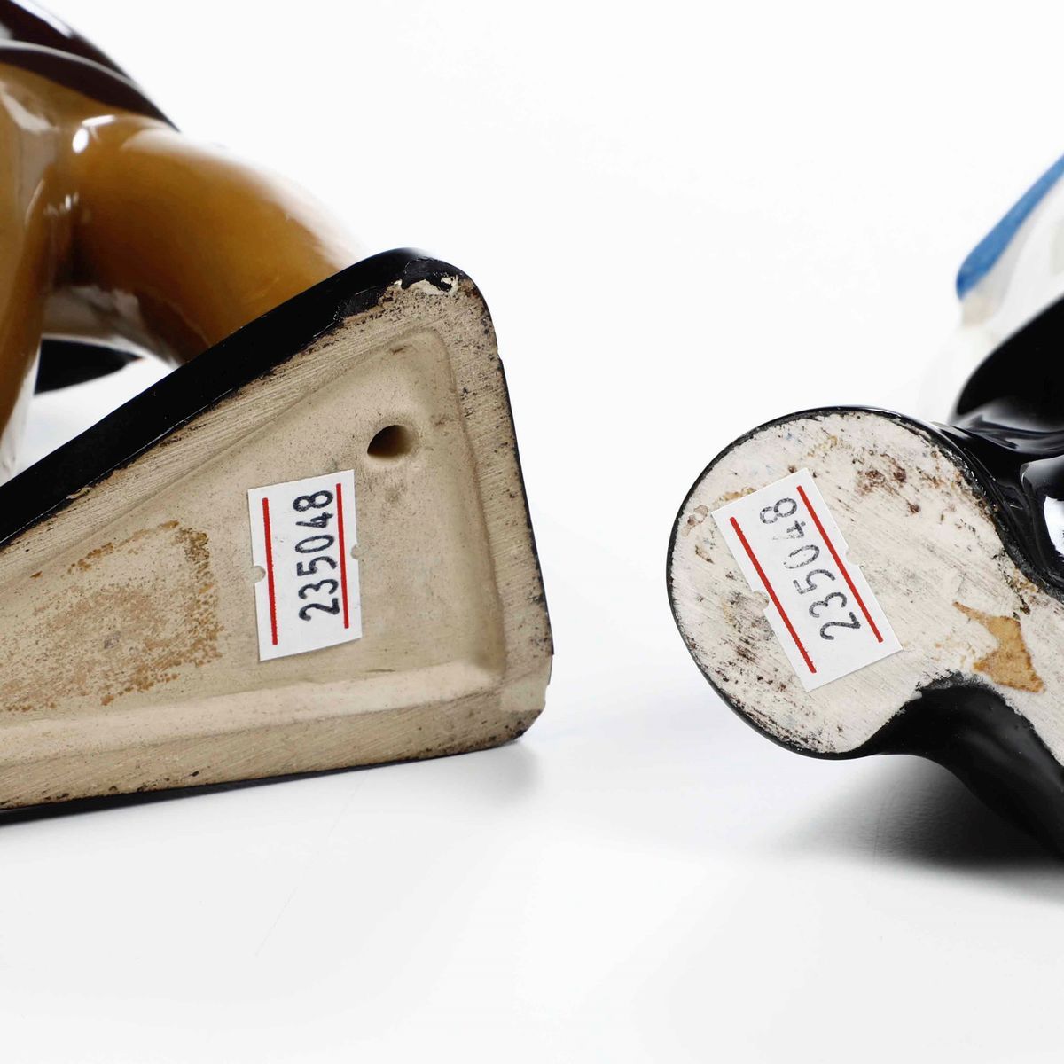 Due sculture raffiguranti suonatore di fisarmonica e marinaio in terracotta maiolicata.