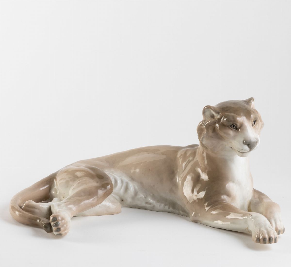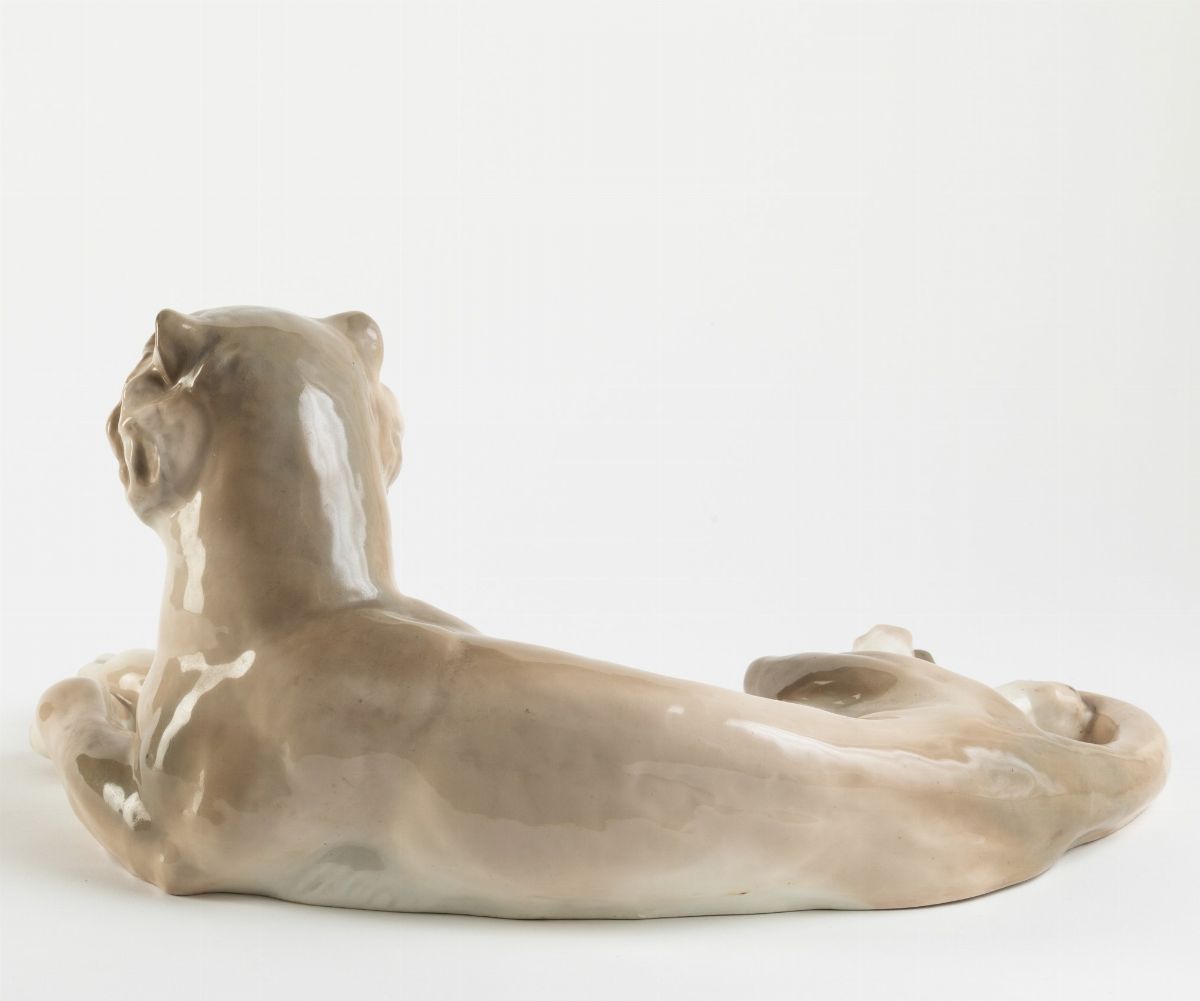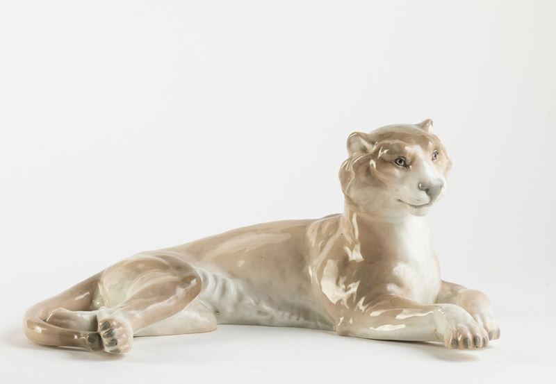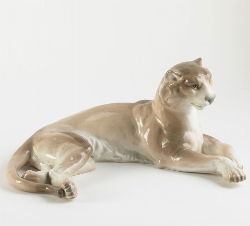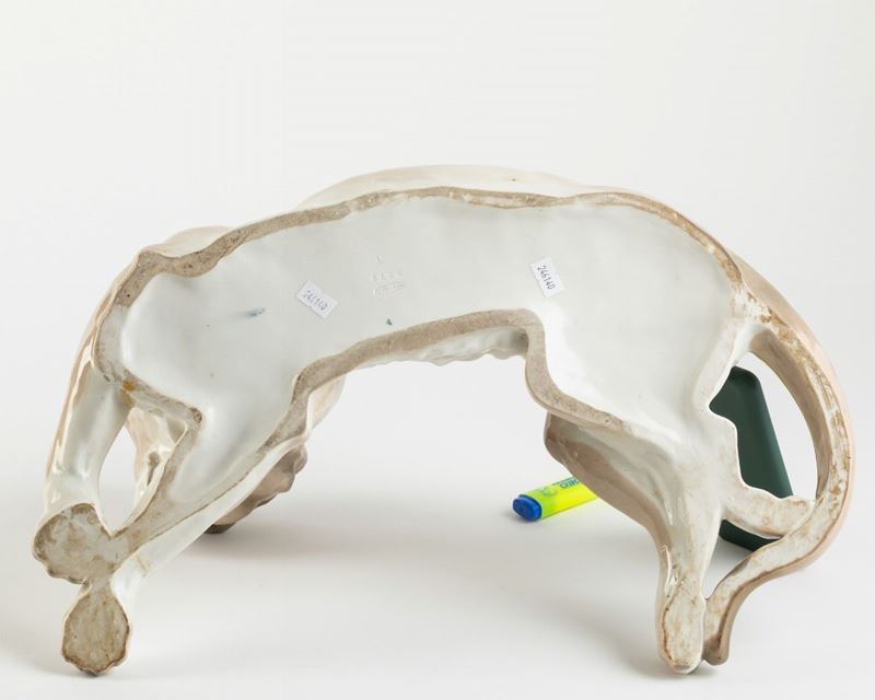 Scultura in terraglia a colaggio raffigurante felino accovacciato, decorato a smalti policromi.