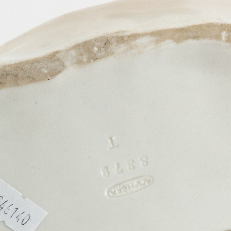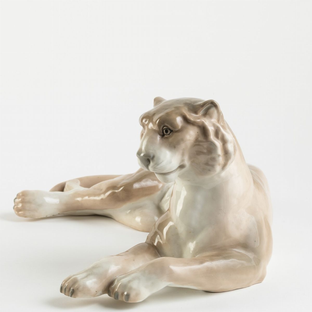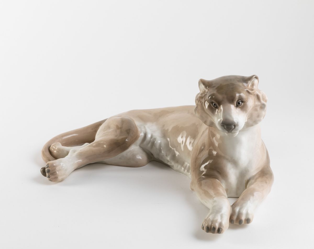 Scultura in terraglia a colaggio raffigurante felino accovacciato, decorato a smalti policromi.