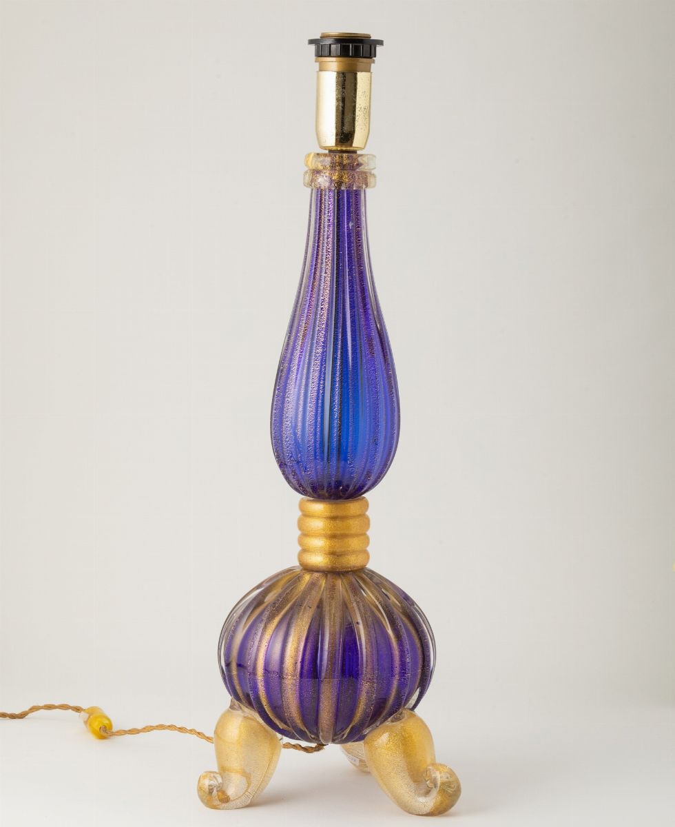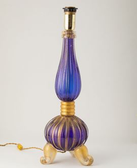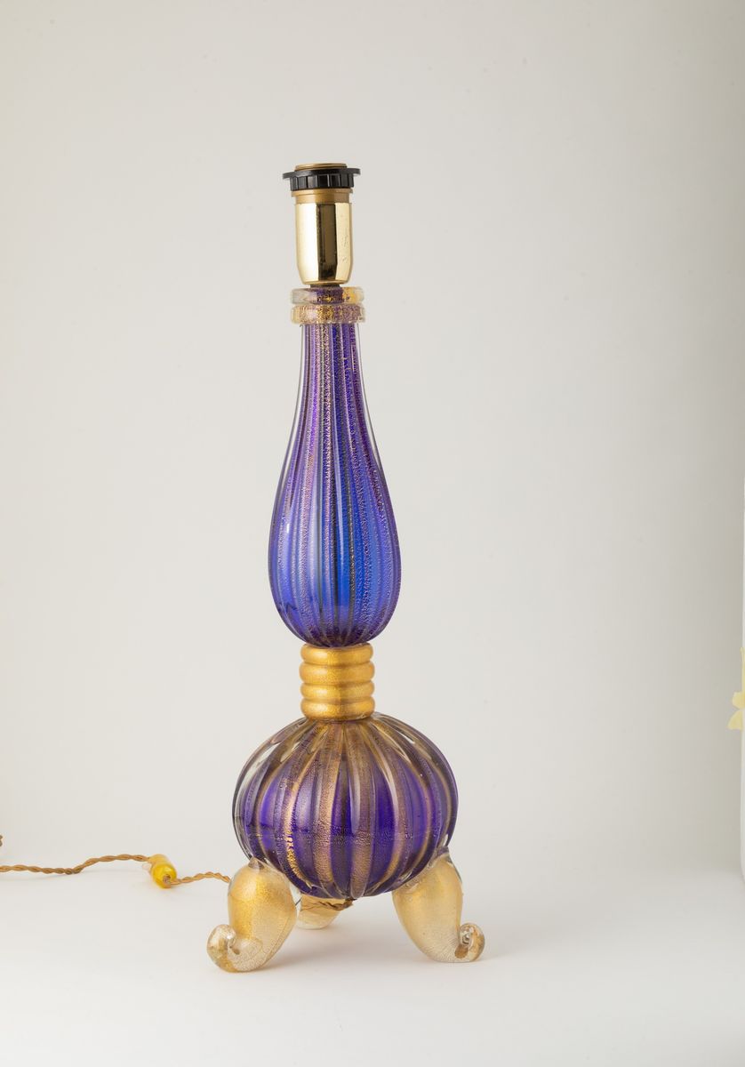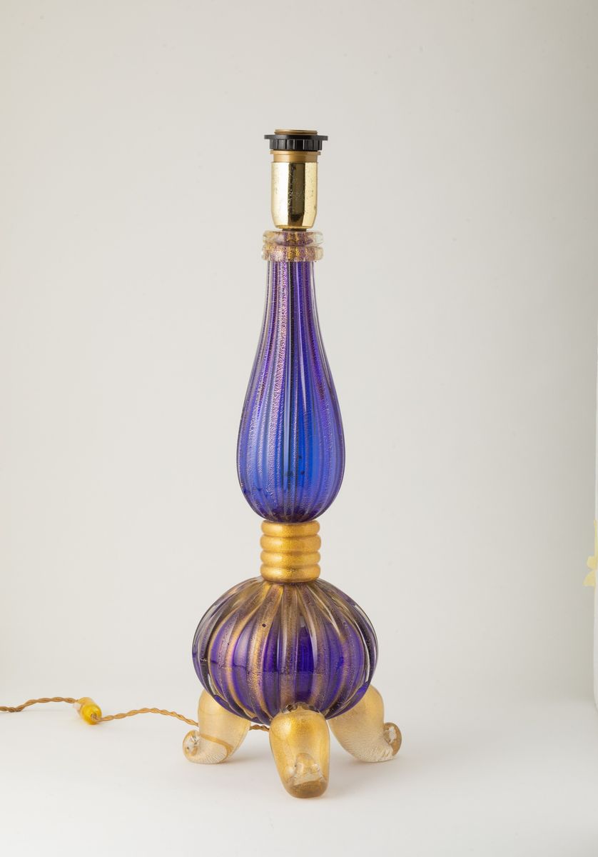 Base di lampada a balaustro in vetro cordonato blu con decoro in foglia oro.