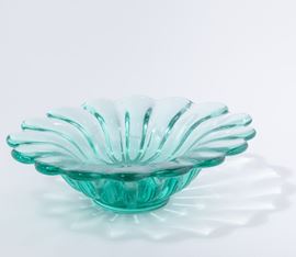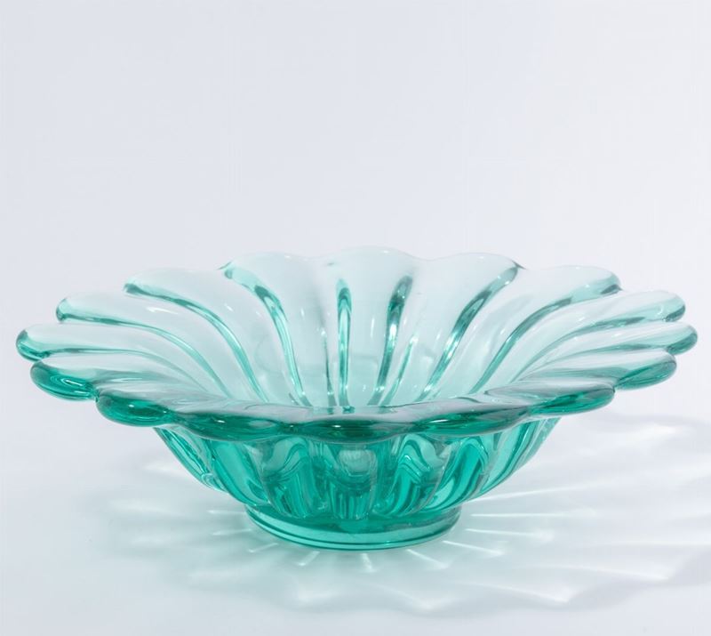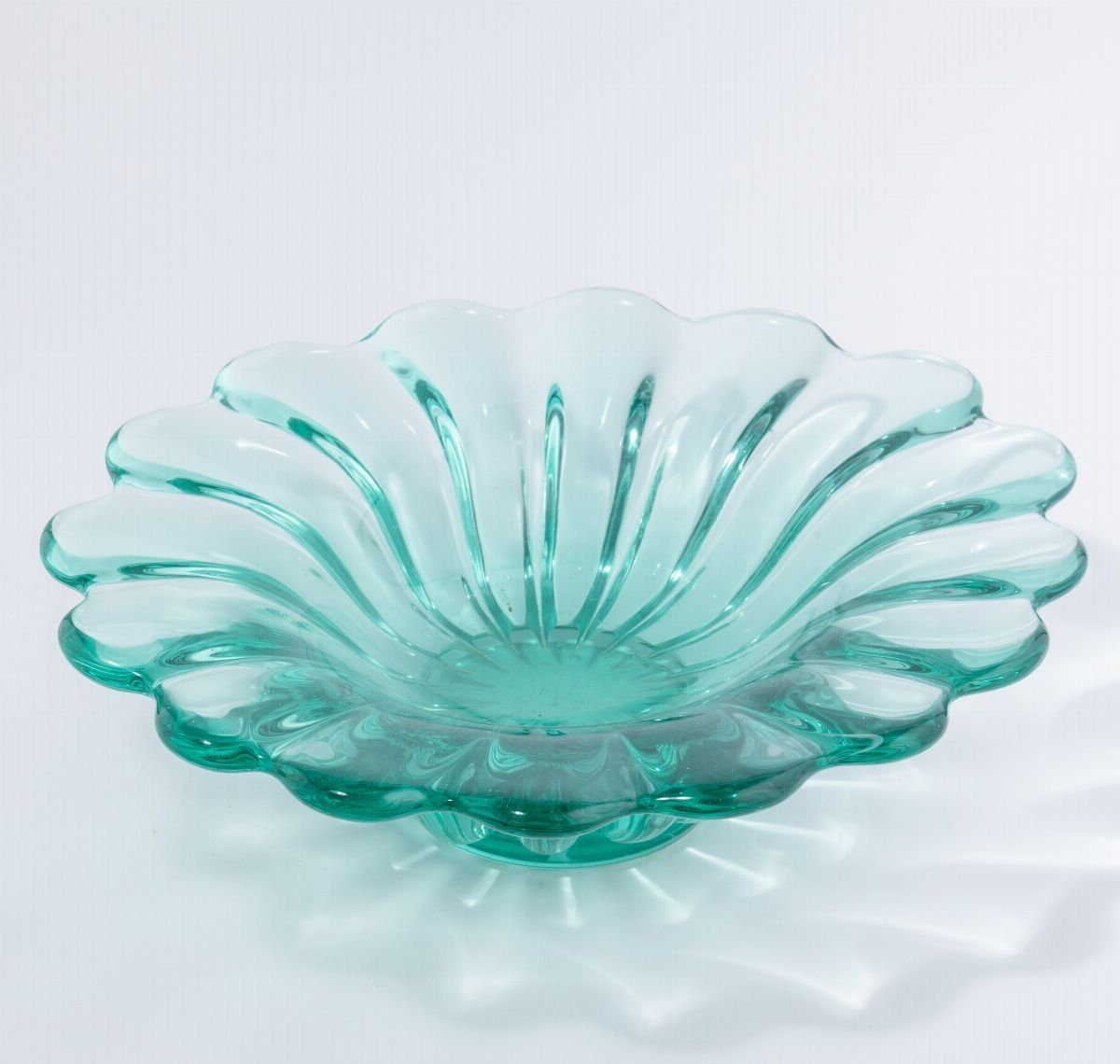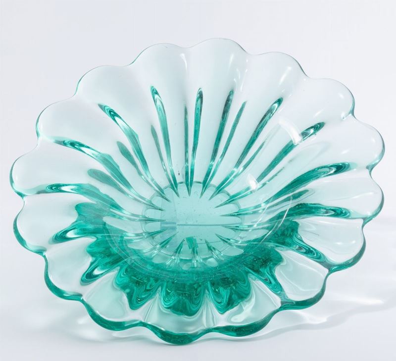 Grande coppa ovale in vetro pesante costolato verdino con piede applicato.