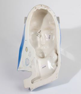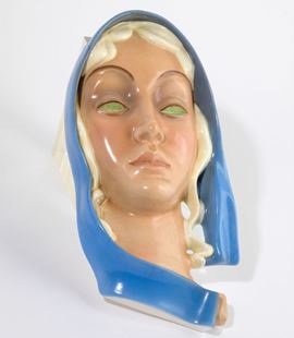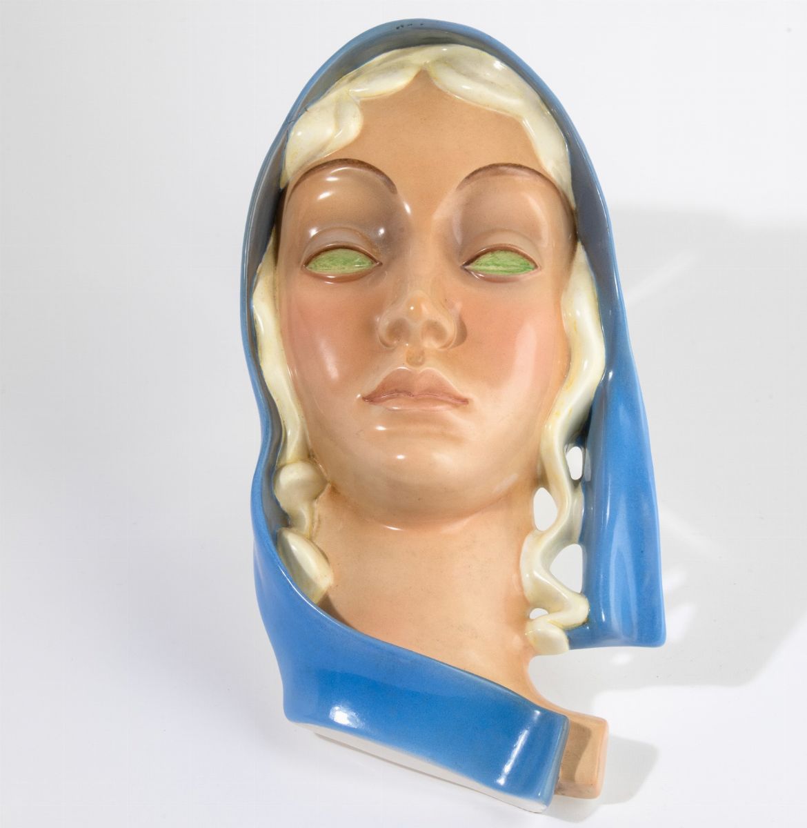 Profilo di testa di donna con velo da appendere in terraglia a colaggio con decoro policromo.