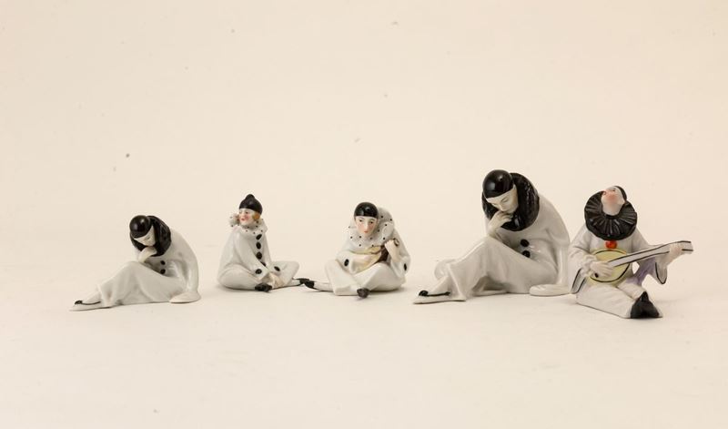 Lotto formato da cinque figurine di Pierrot in porcellana.