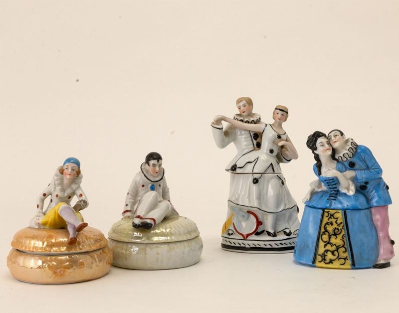 Lotto formato da quattro scatole in porcellana con decoro policromo raffiguranti Pierrot e Damine.