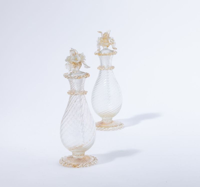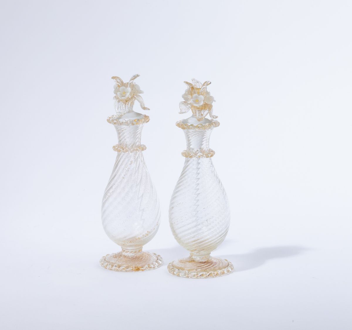 Coppia di vasi in vetro soffiato a torciglione con coperchi con tappi a fiore applicati. Decoro in foglia oro.