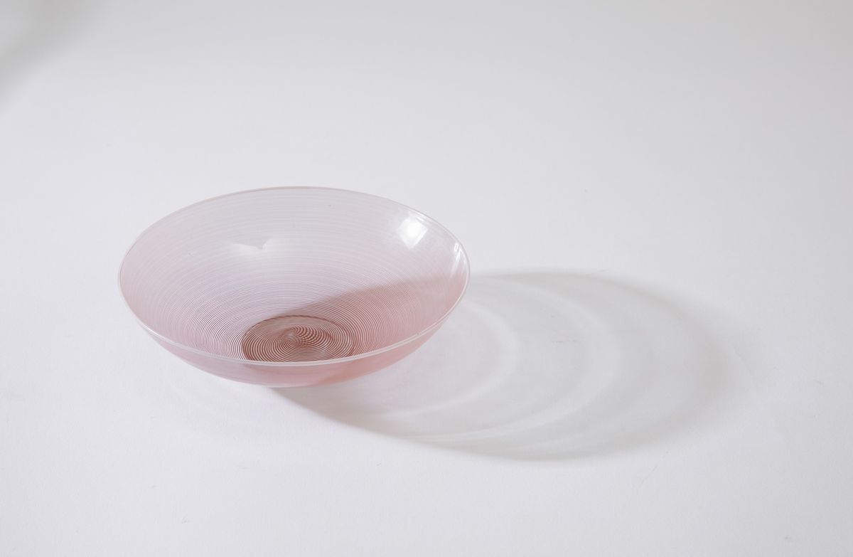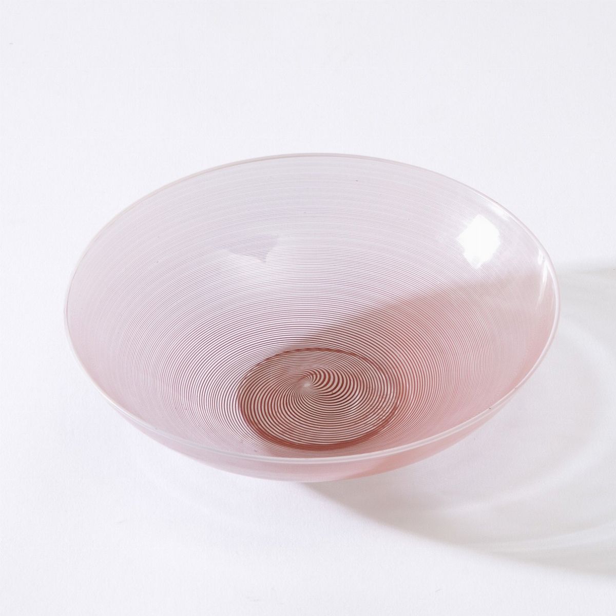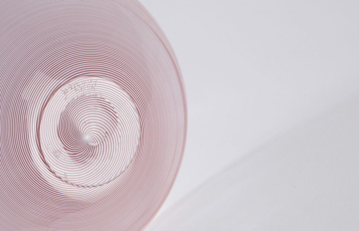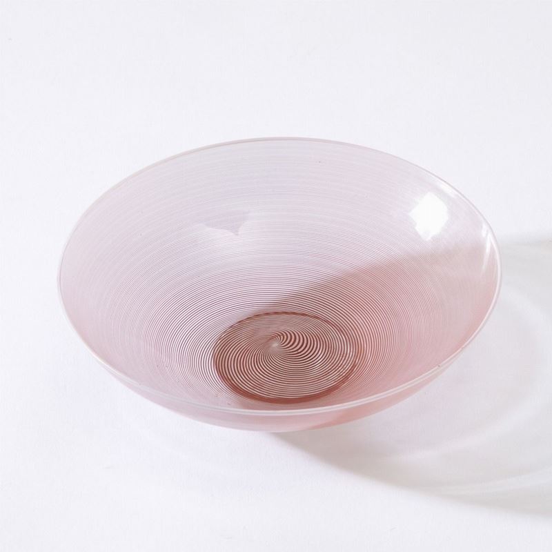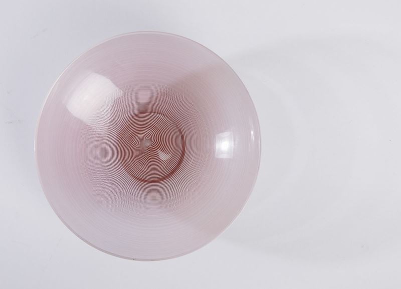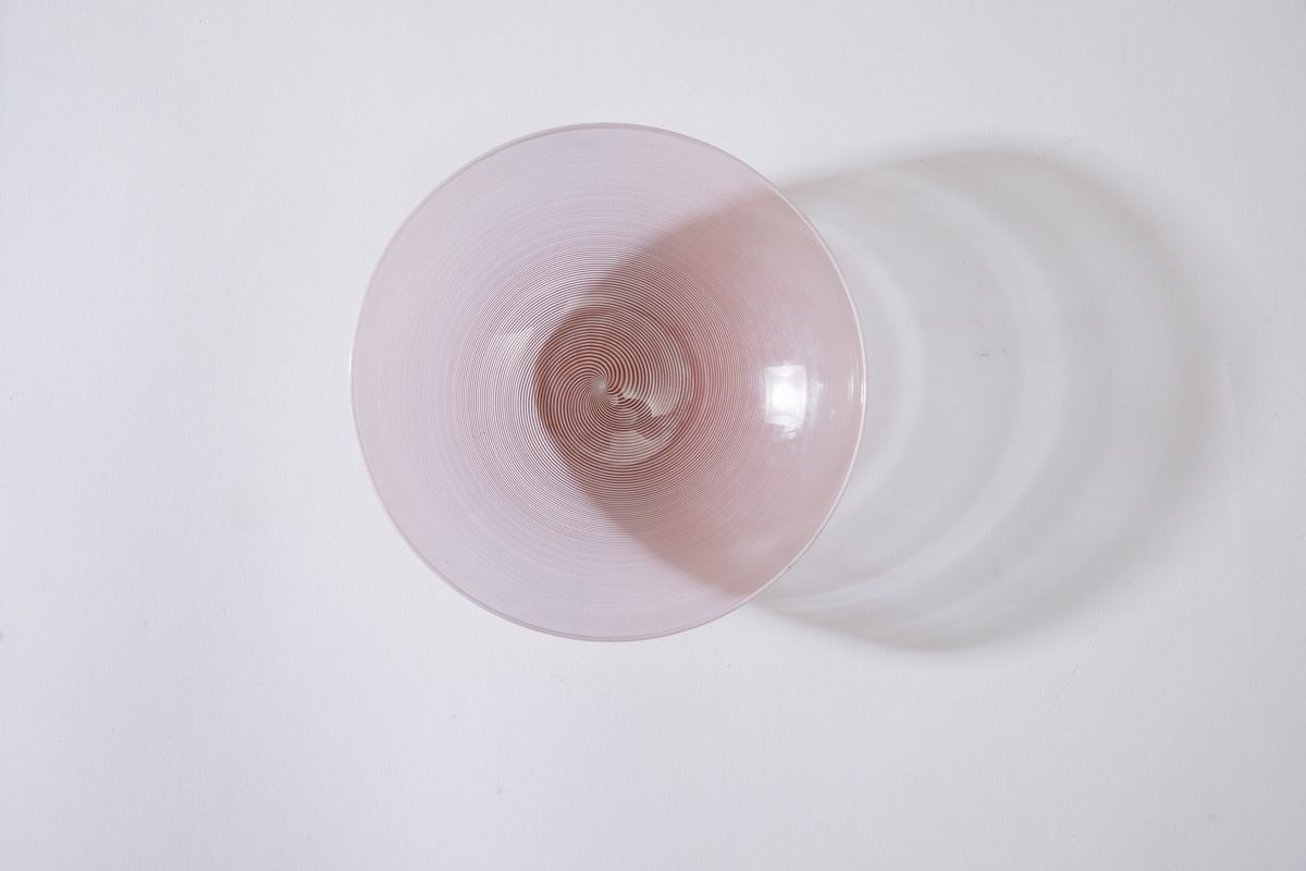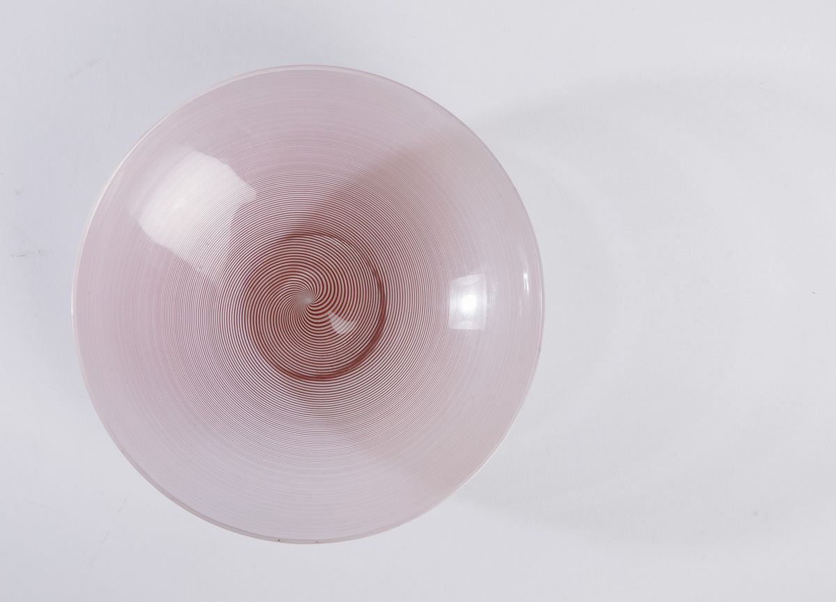 Coppa in vetro soffiato in filigrana rossa con bordo lattimo.