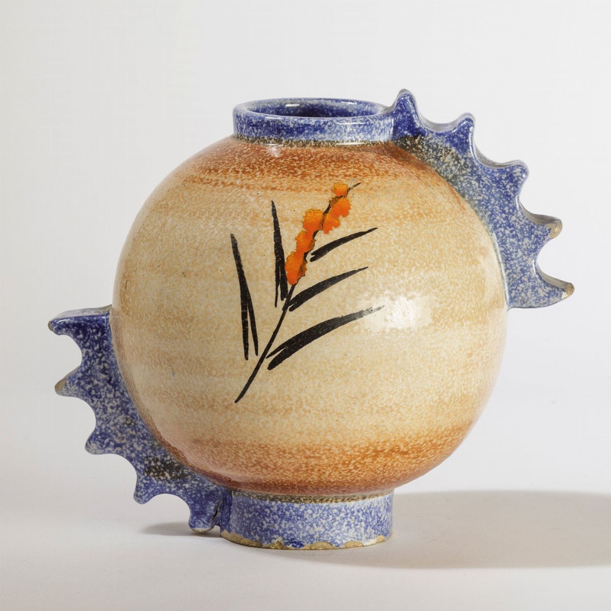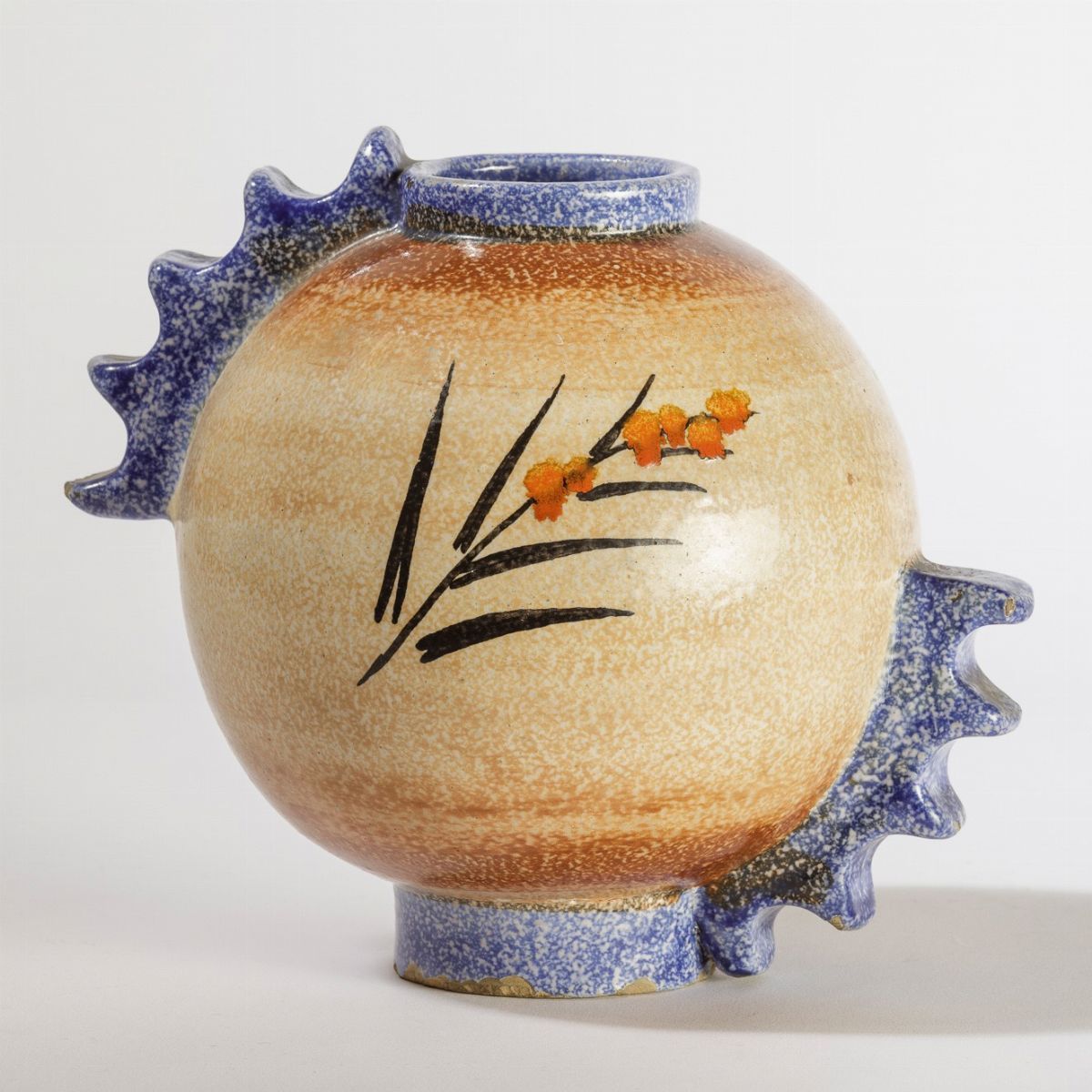 Vaso futurista a sfera con piede e collo cilindrici e anse asimmetriche a raggiera in ceramica con decoro di smalti policromi e fiori stilizzati.