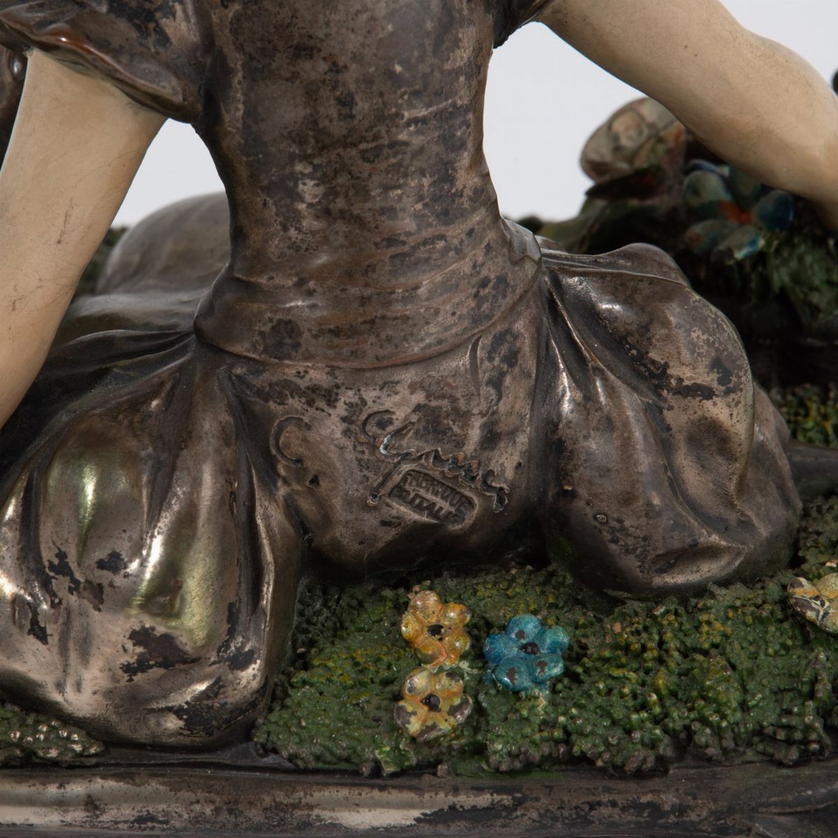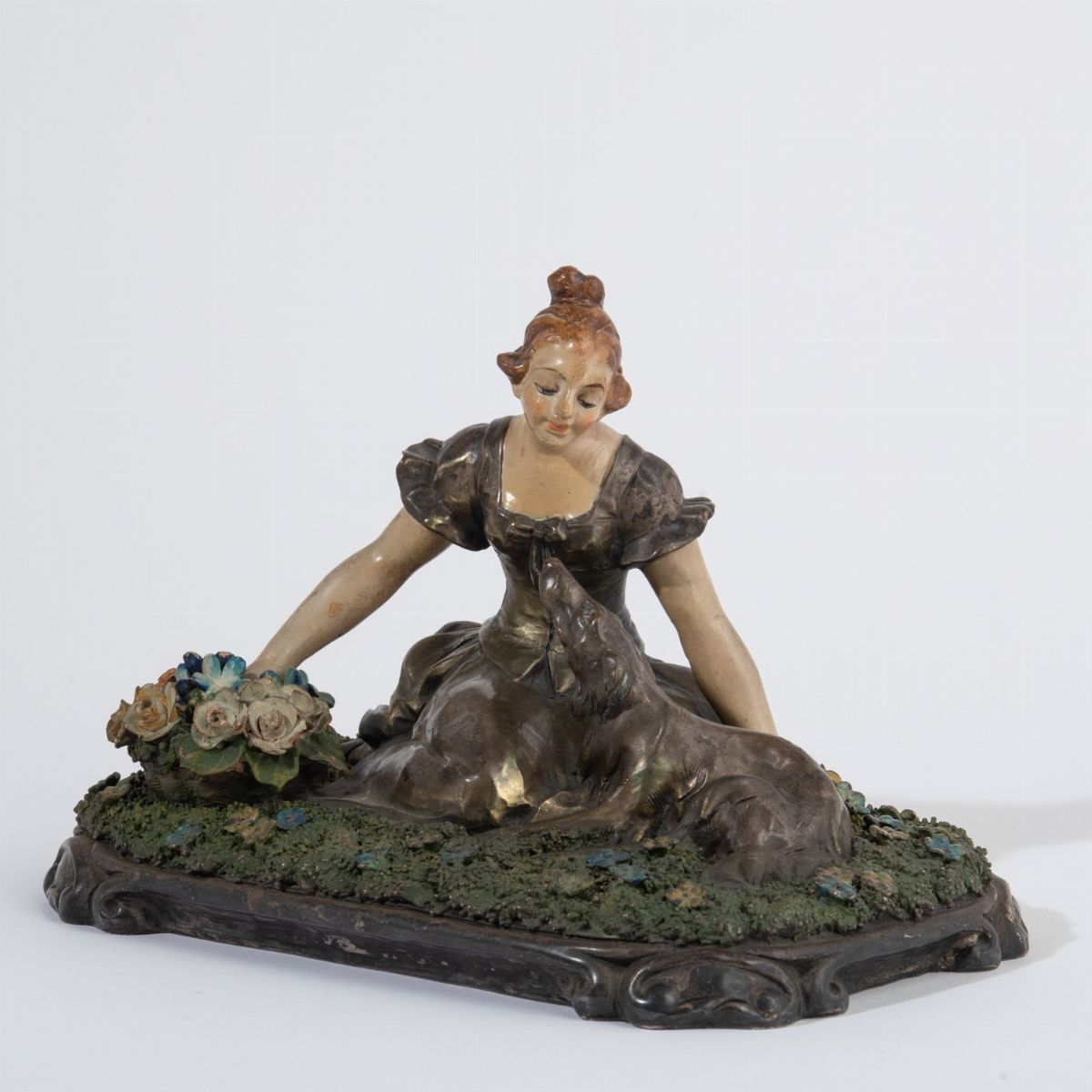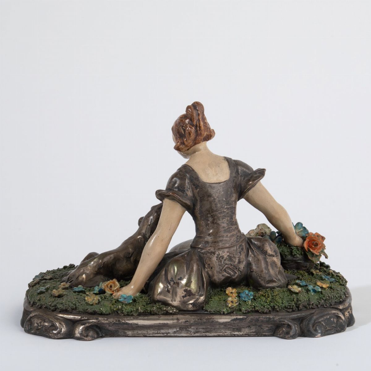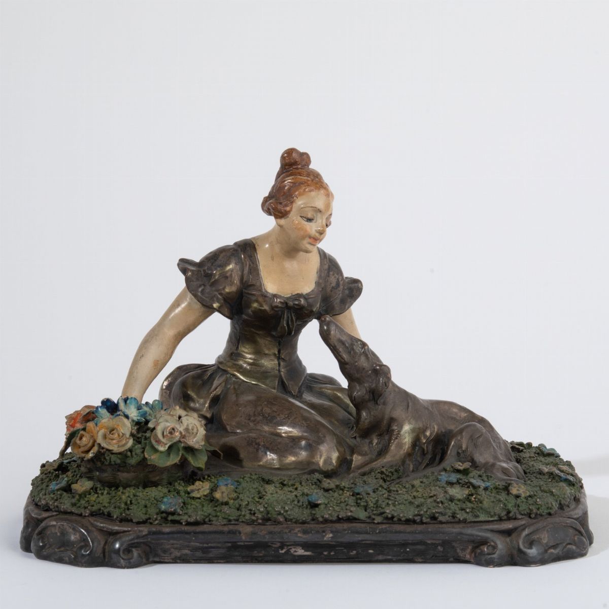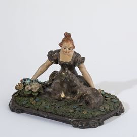 Scultura in terracotta con rivestimento metallico raffigurante donna seduta su prato di fiori.