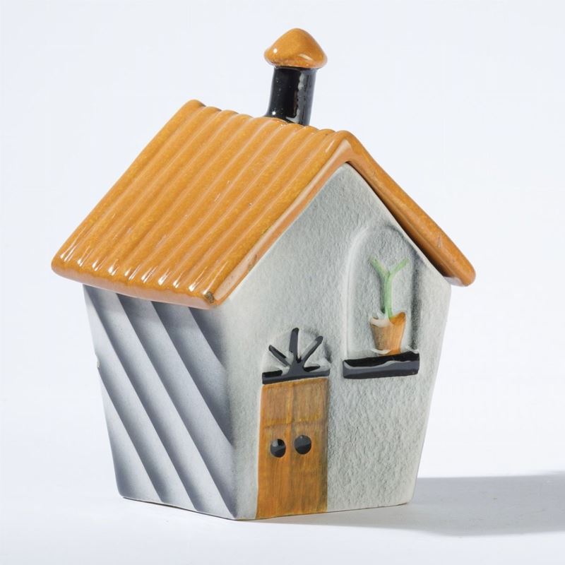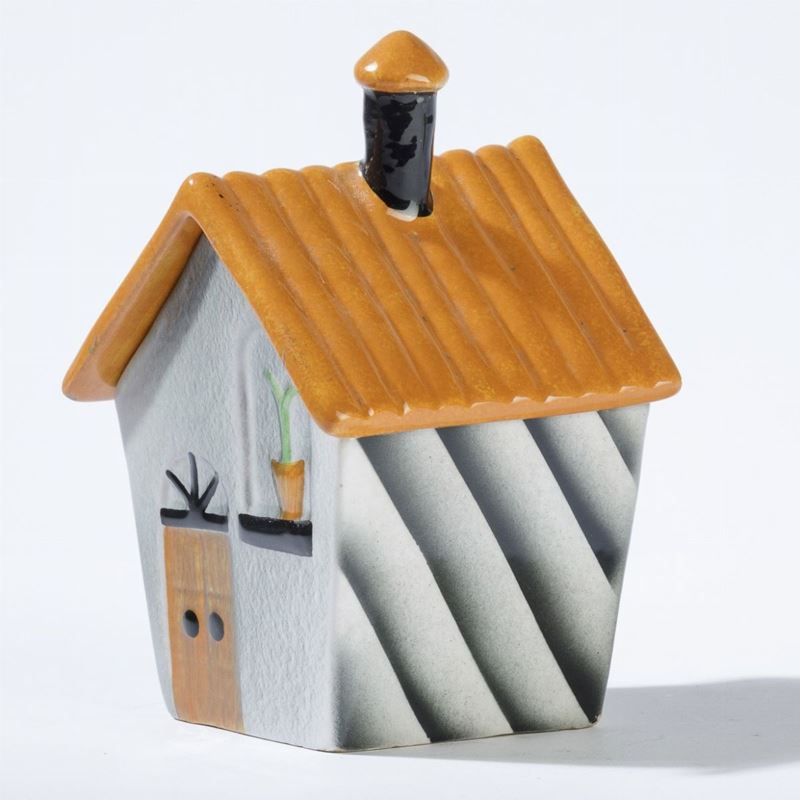 Rara scatola con coperchio in forma di casa in terracotta dipinta a mano e all'areografo.
