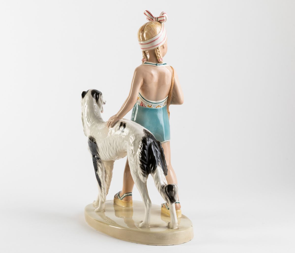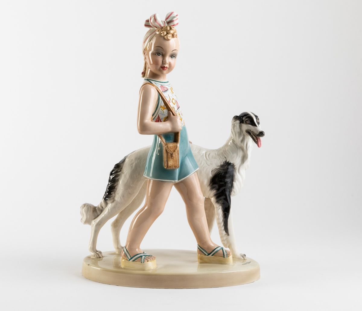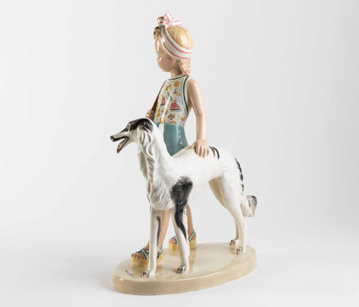 Scultura in terraglia a colaggio raffigurante ragazzina con levriero e decoro a smalti policromi e incisioni.