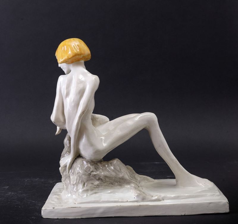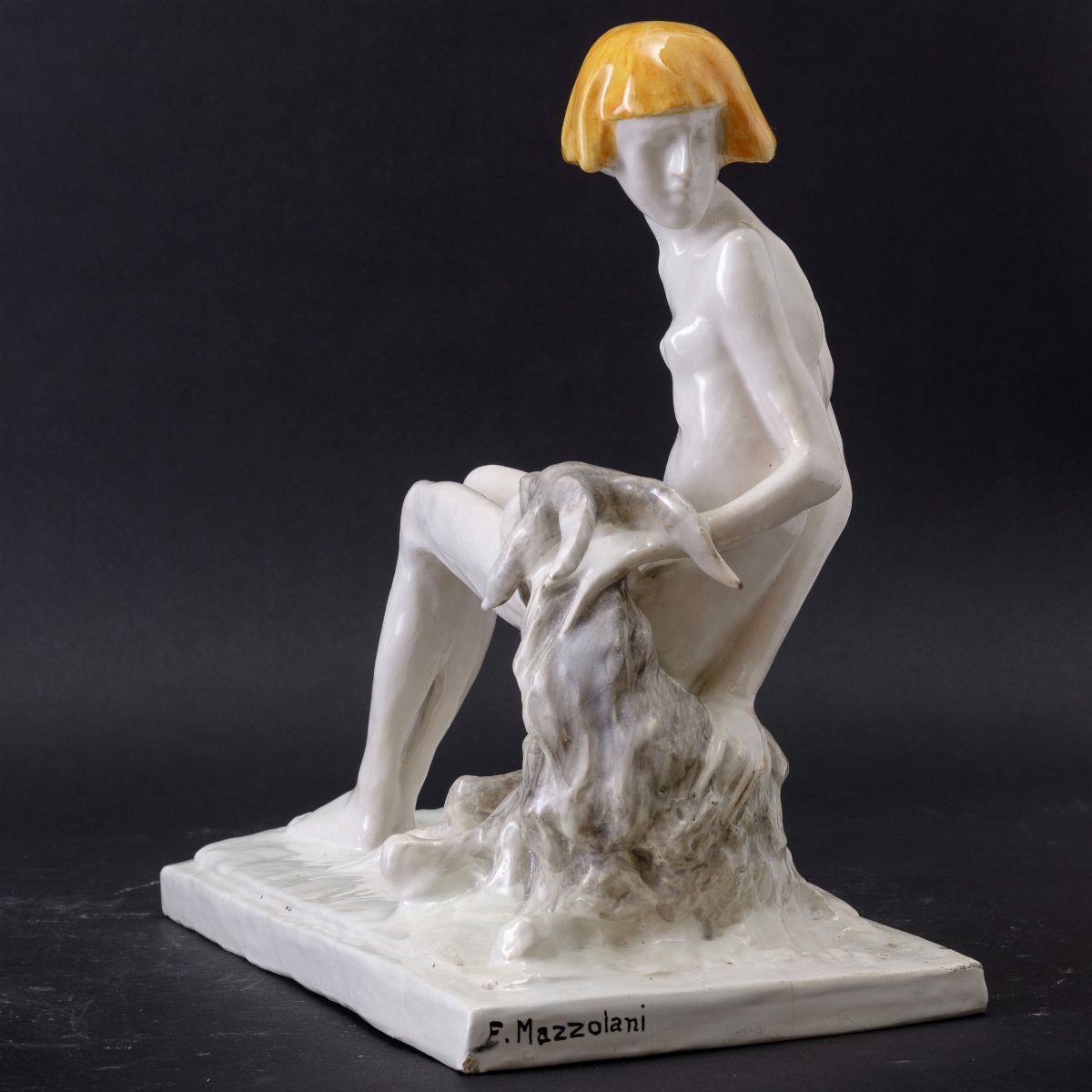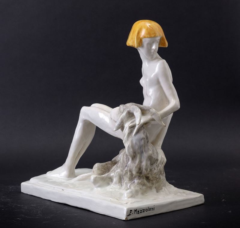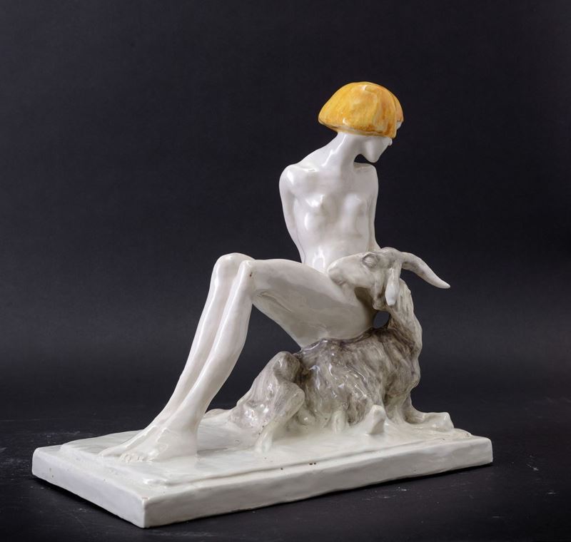 Scultura in terracotta maiolicata raffigurante nudino di donna con capra a leggera policromia.