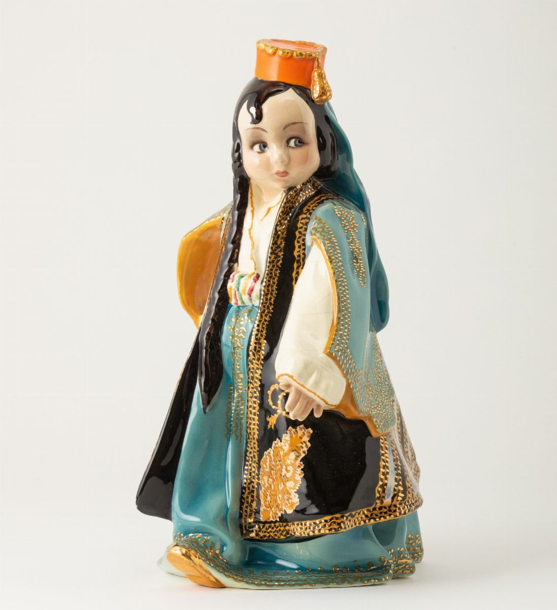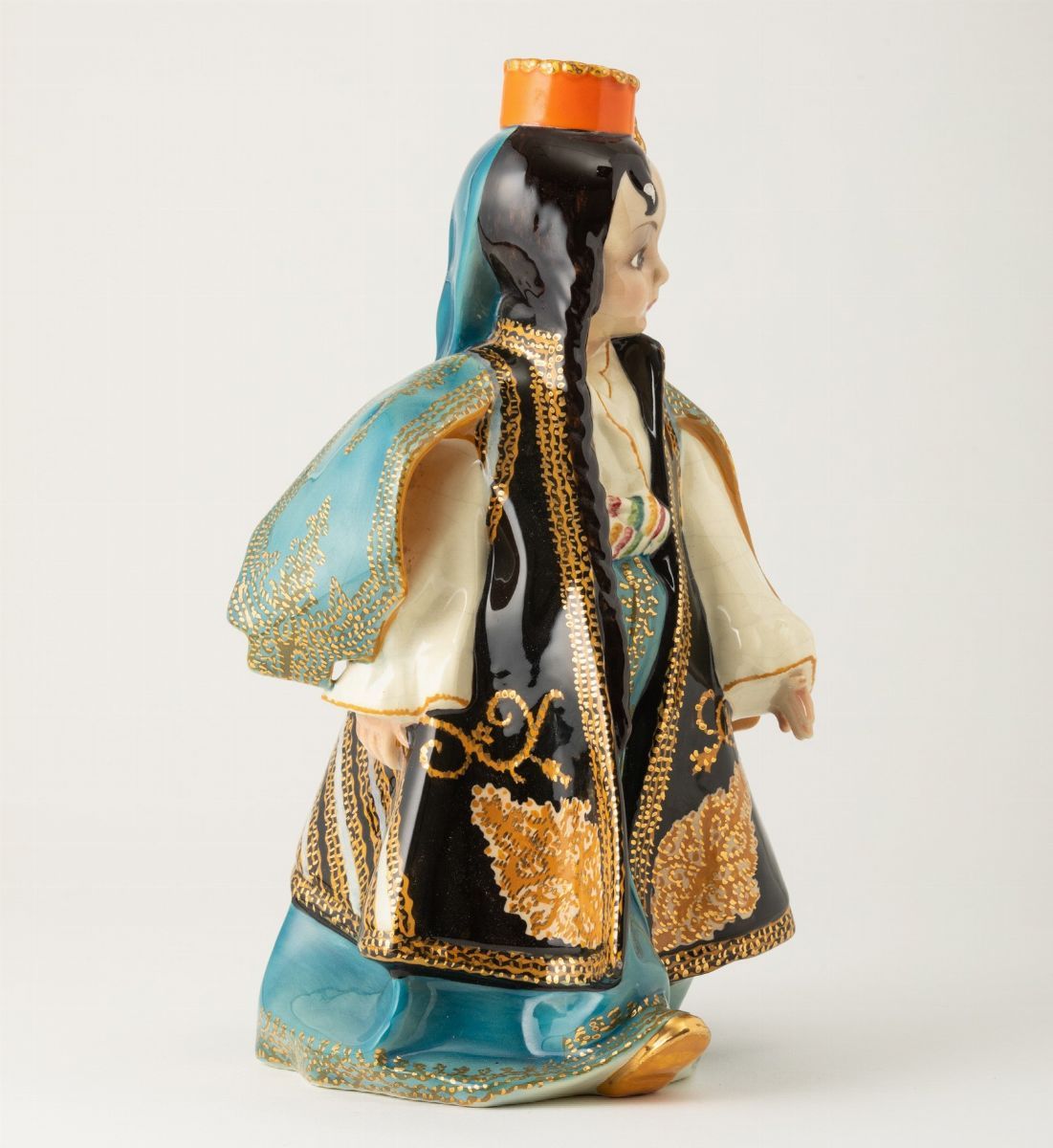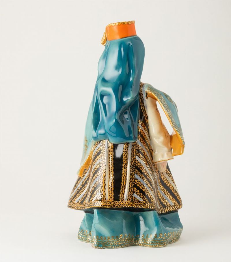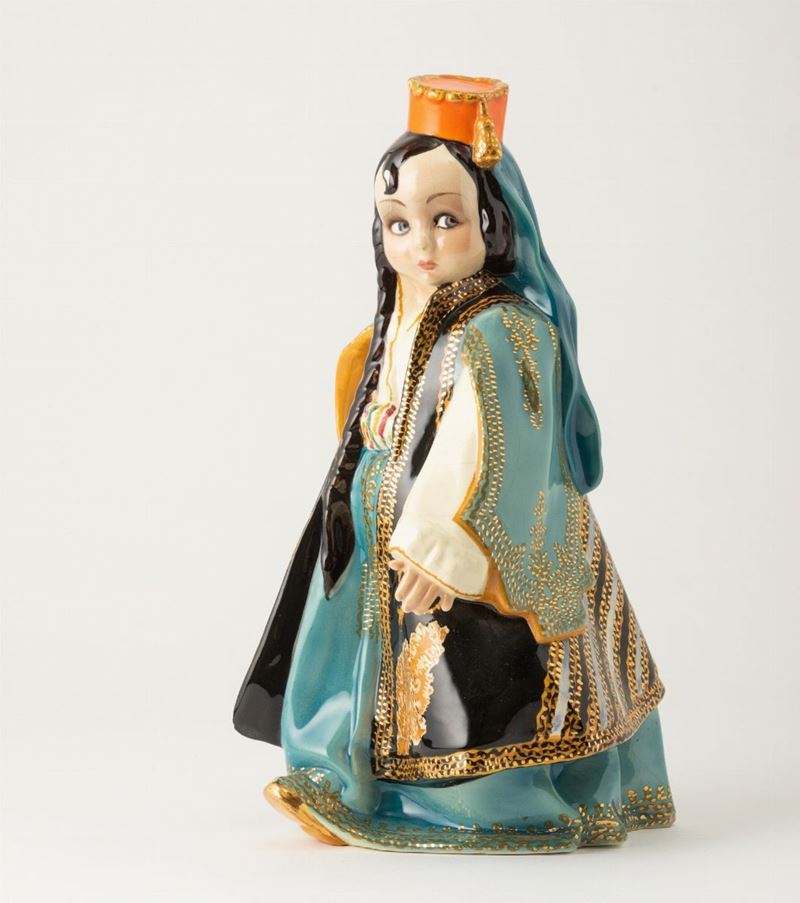 Scultura raffigurante bambina in costume ottomano in terraglia a colaggio con decoro in policromia e dorature.
