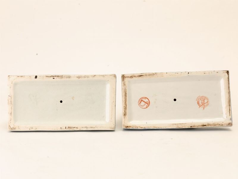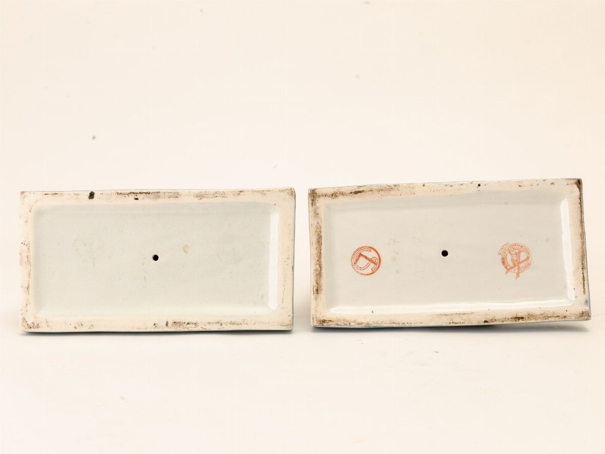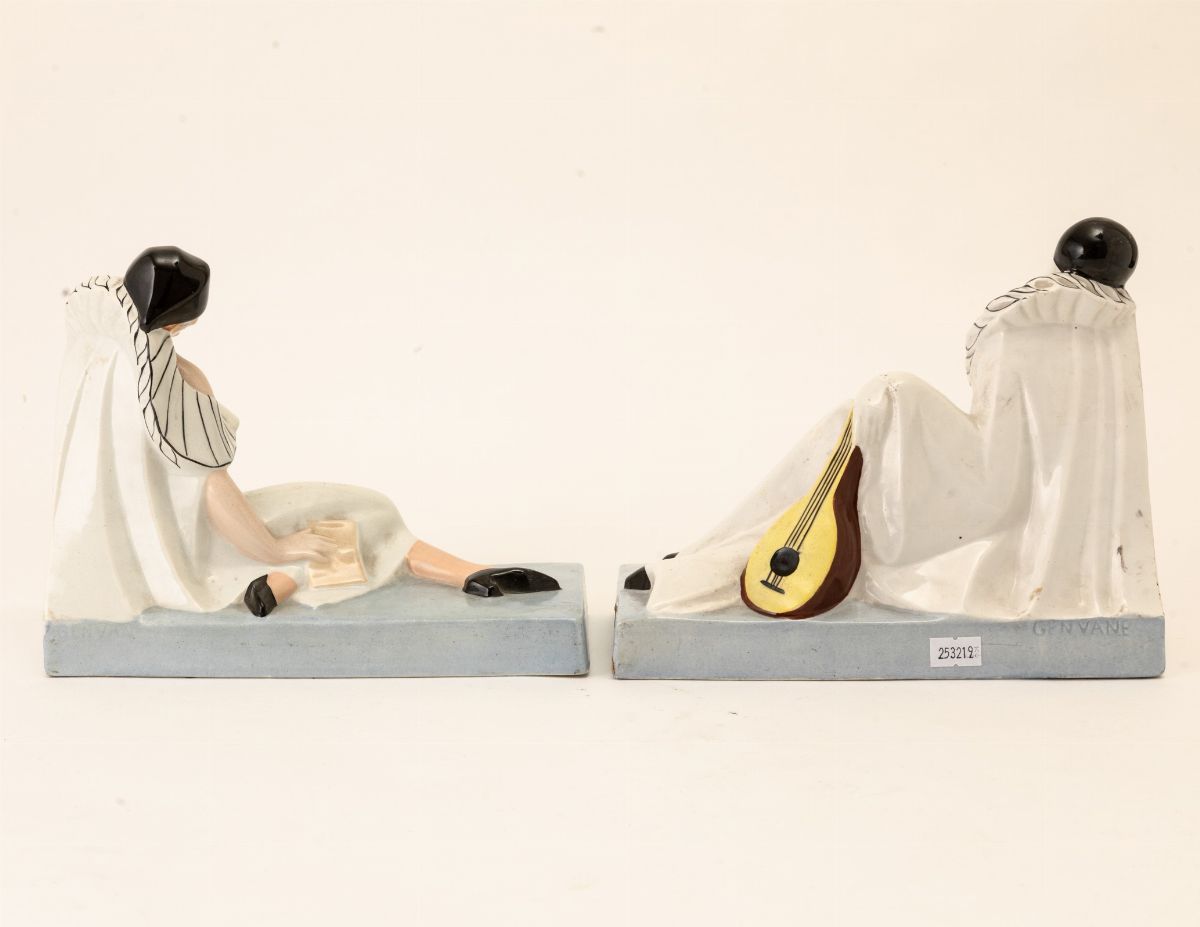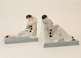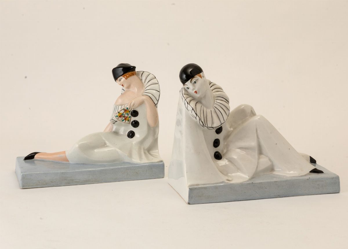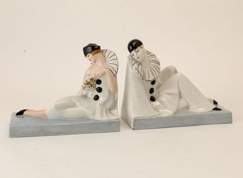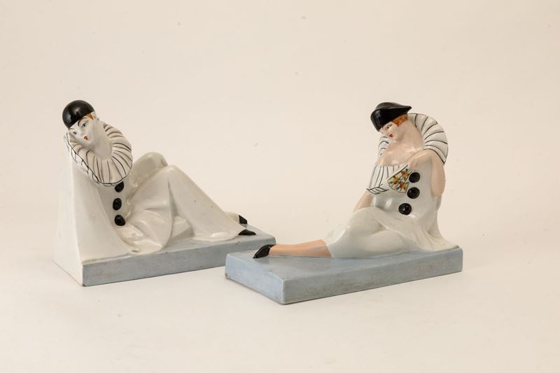 Coppia di reggilibri in terraglia a colaggio raffigurante due Pierrot con decoro a smalti policromi.