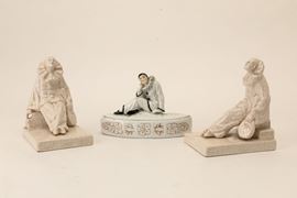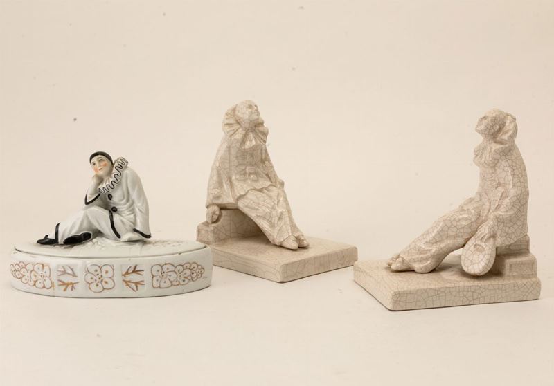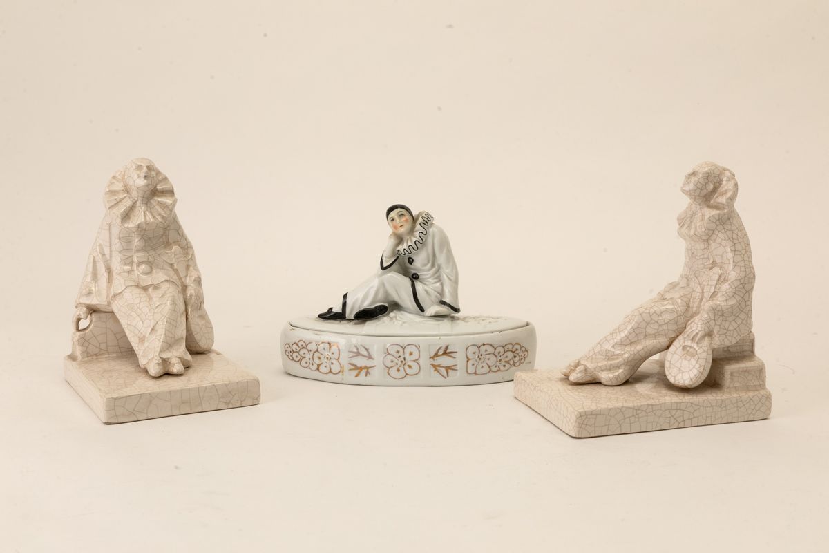 Coppia di reggilibri a foggia di Pierrot e scatola ovale in porcellana con coperchio in guisa di Pierrot. Decoro a smalti e dorature.