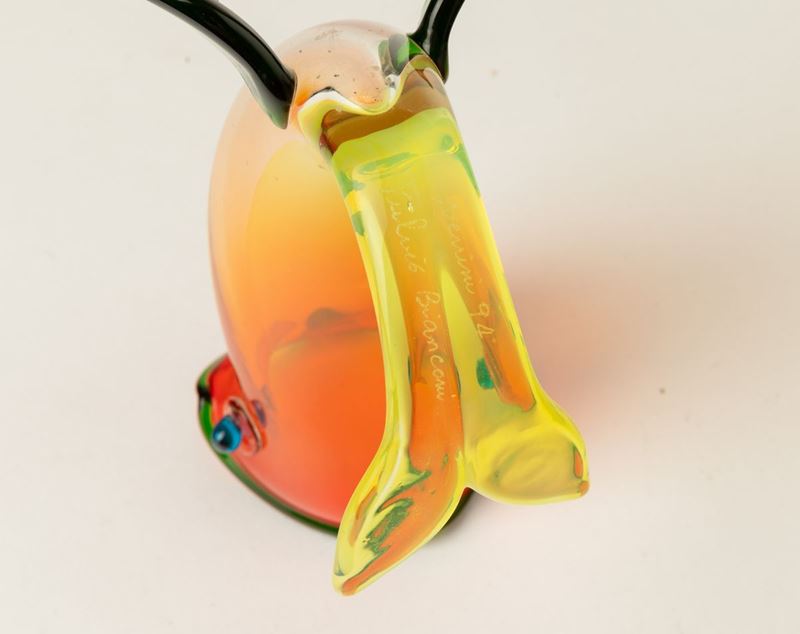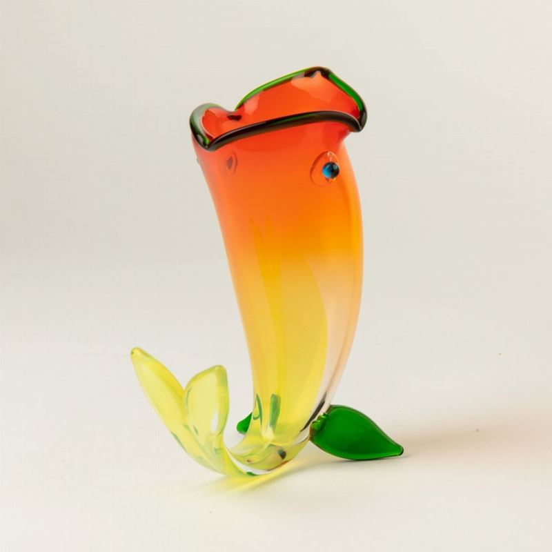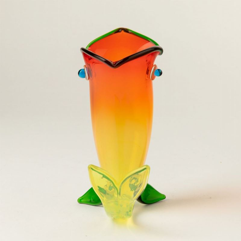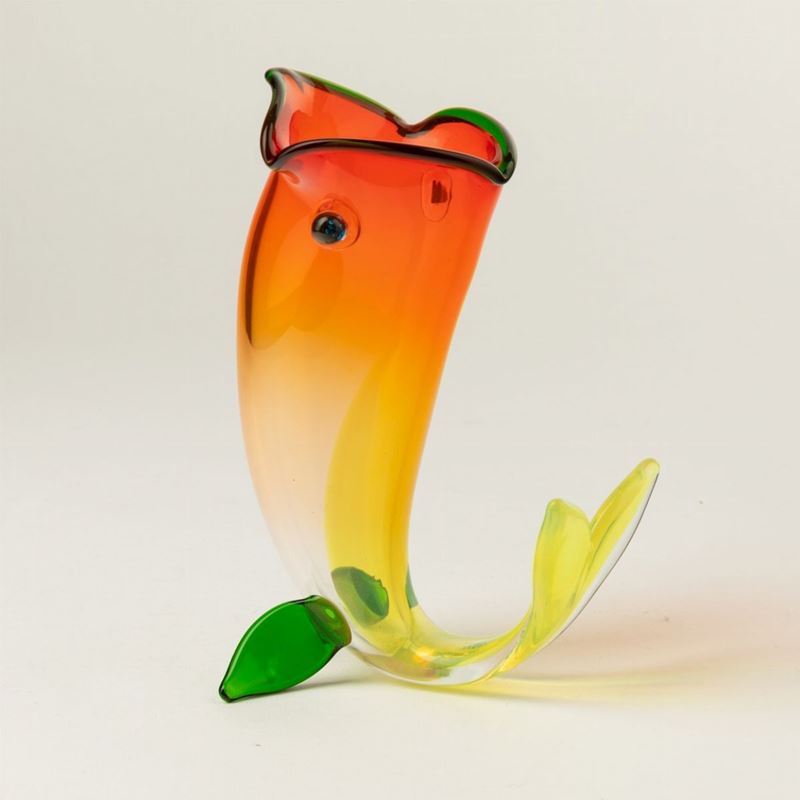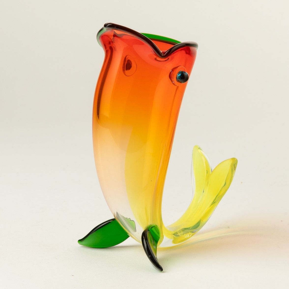 Vaso in forma di pesce in vetro soffiato con bocca, occhi e pinne applicati.
