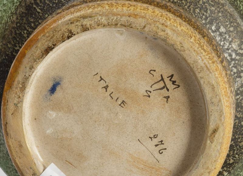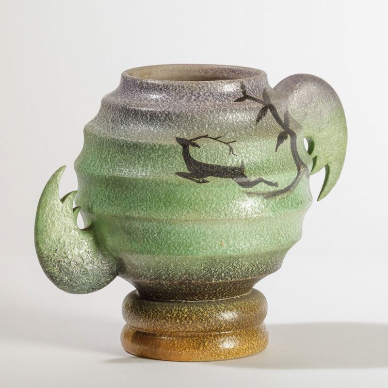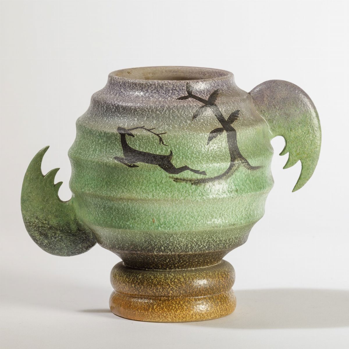 Vaso a sfera a costolature convesse su piede a doppio cordolo con anse asimmetriche ad ala di pipistrello in ceramica con decoro a smalti policromi e animali in paesaggio.