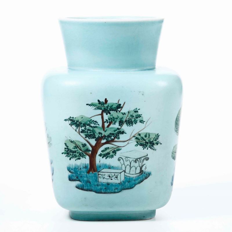 Vaso troncopiramidale a sezione quadrata con collo svasato circolare in terraglia a colaggio con decoro di paesaggi a smalti e incisioni.