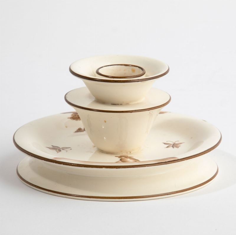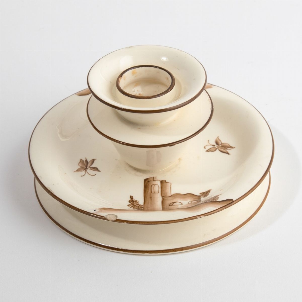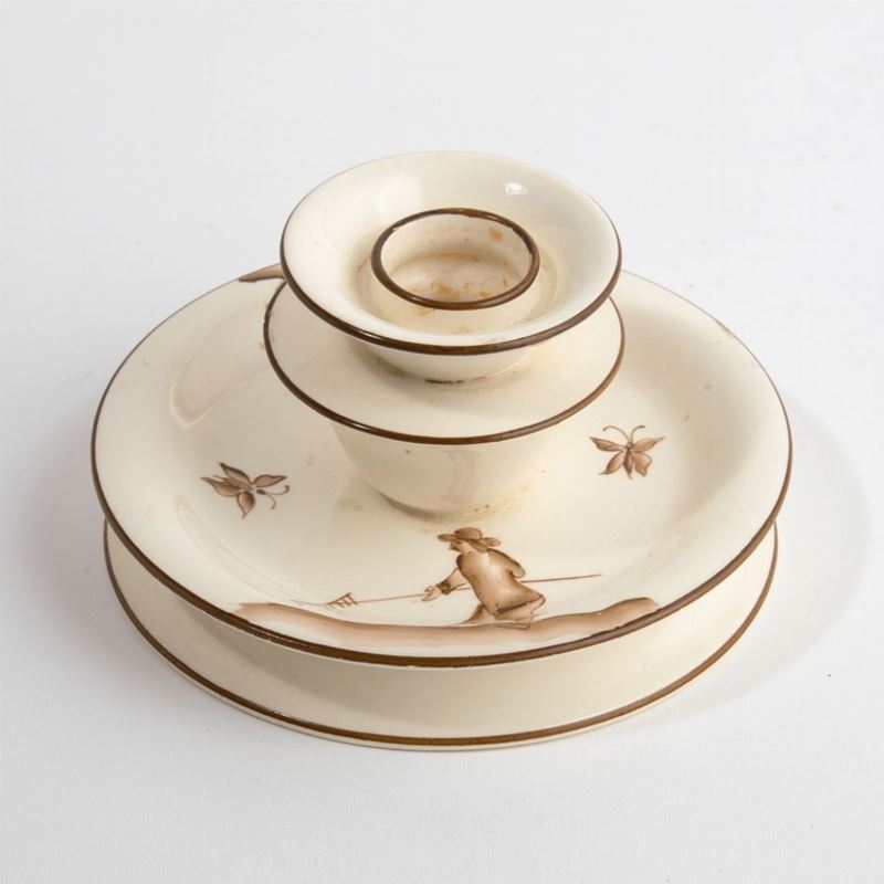 Portacandele in terraglia a colaggio con decoro di personaggi in monocromia.
