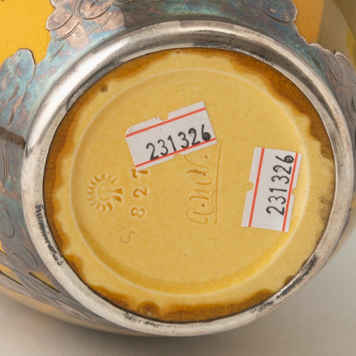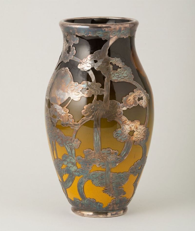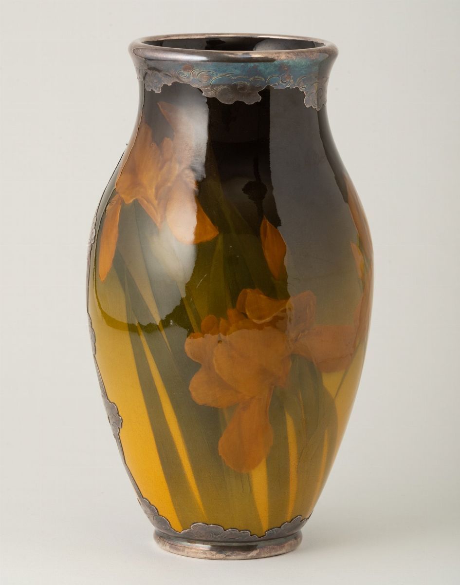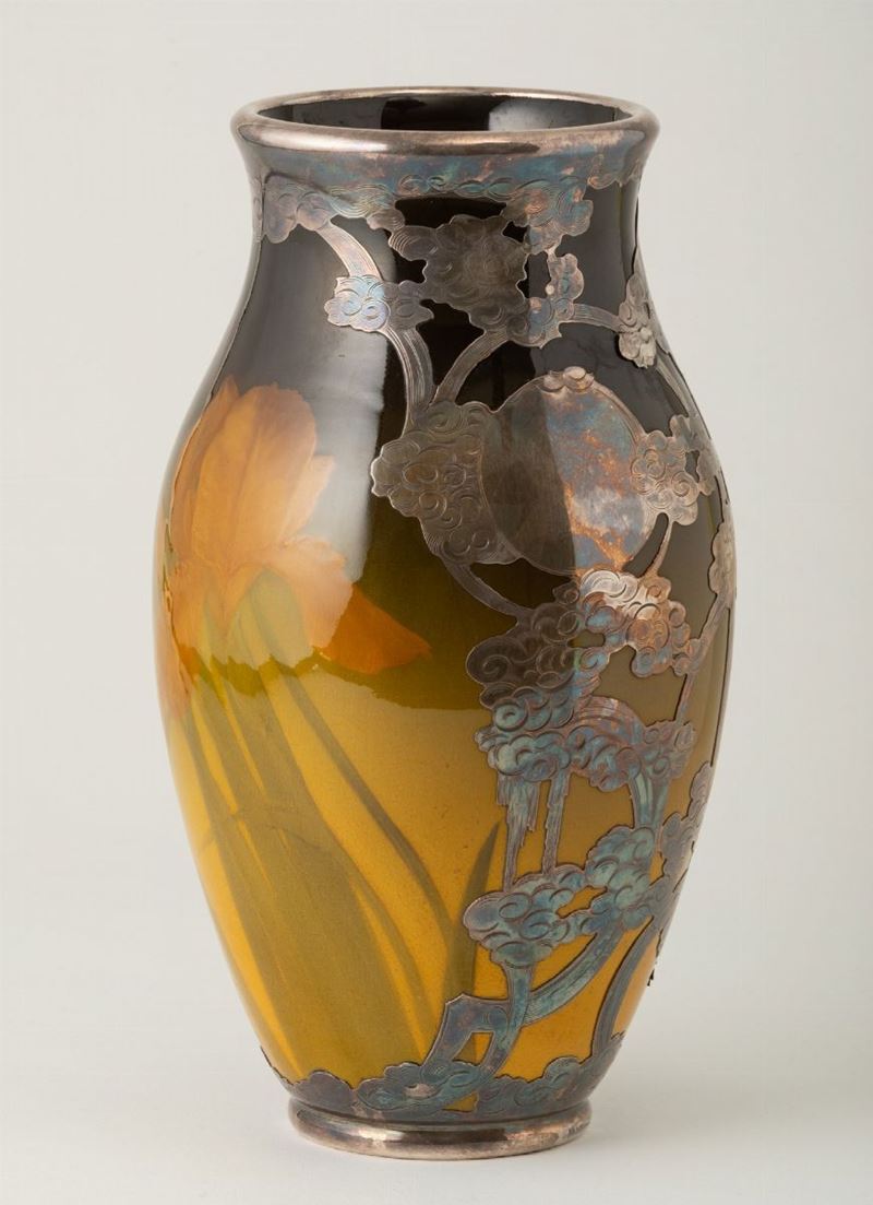 Vaso in terraglia con decoro di ireos a smalti policromi e parzialmente ricoperto da lamina in argento con decoro di fogli a traforo.