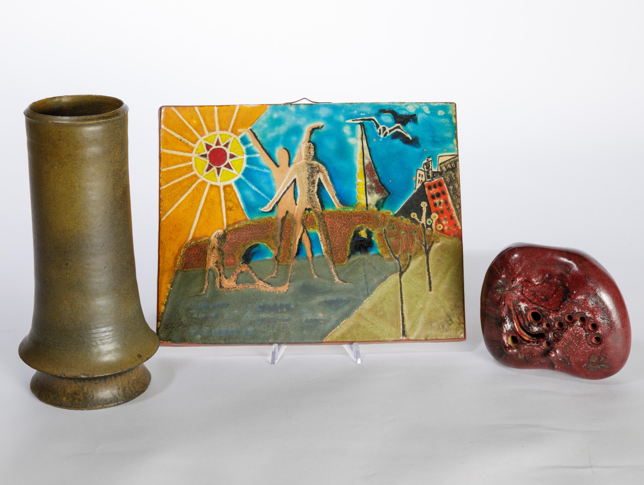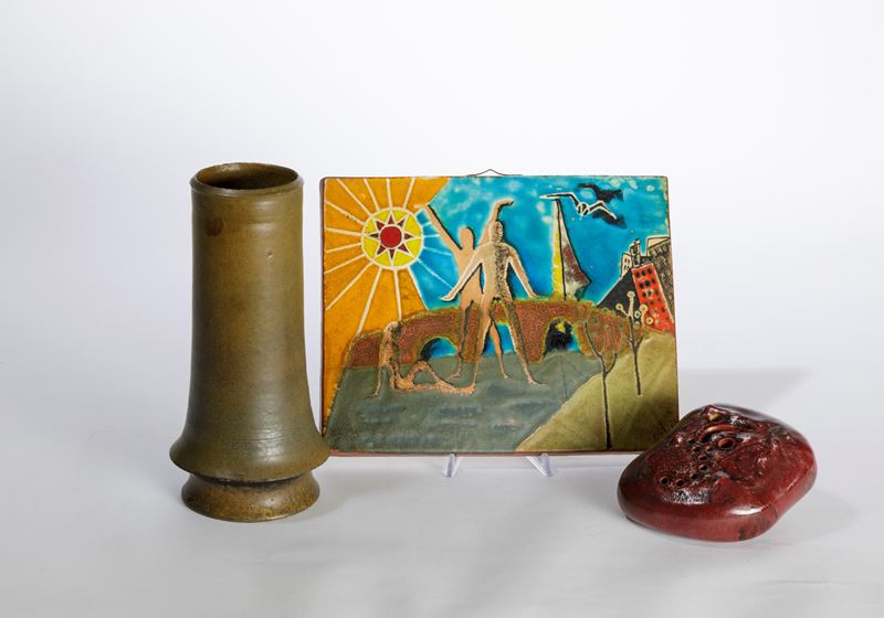 Vaso in gres, scultura in forma di sasso e placca rettangolare.