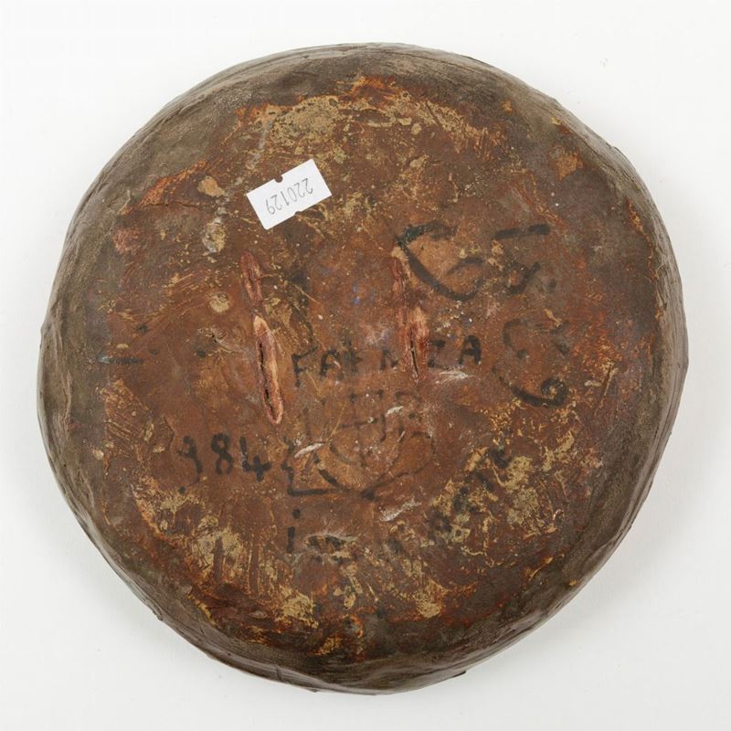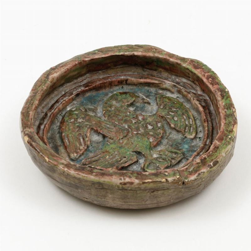 Ciotola in terracotta maiolicata con figura di aquila a rilievo.