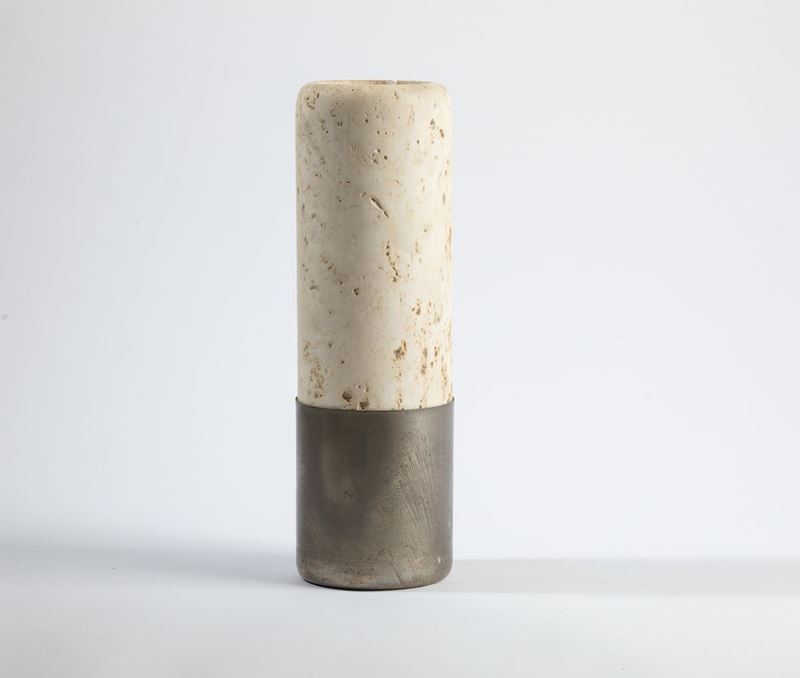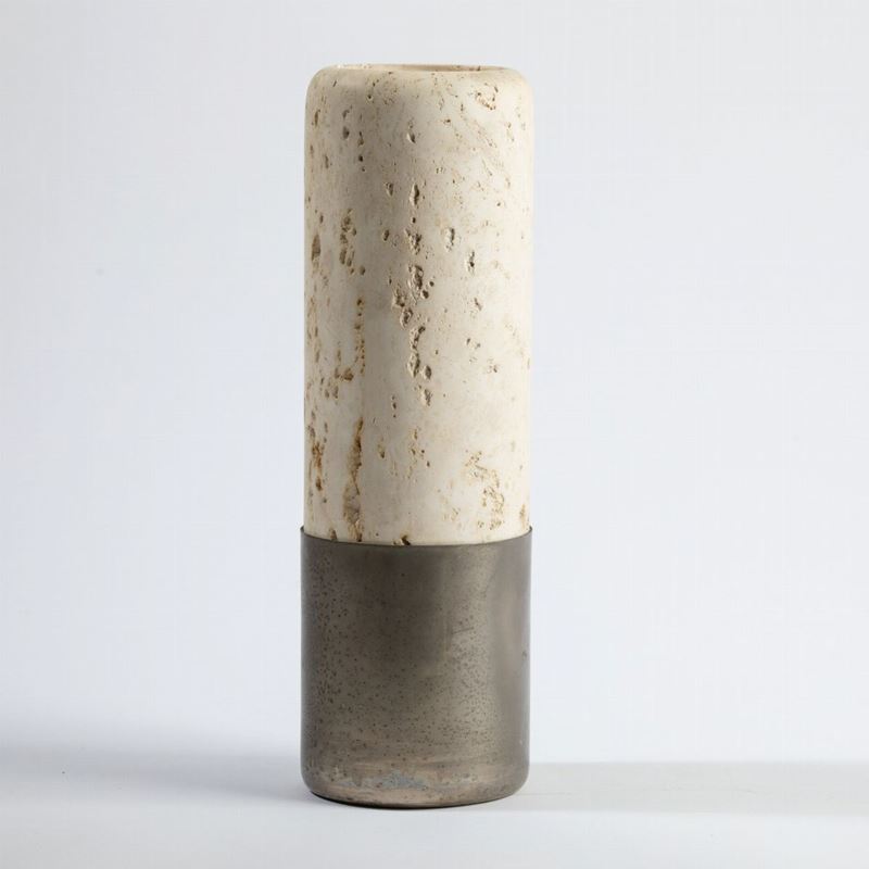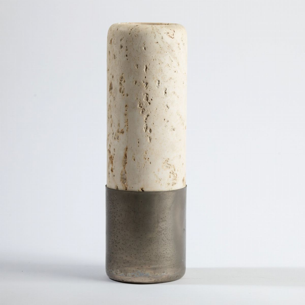 Vaso cilindrico in travertino scavato rivestito alla base in metallo argentato.