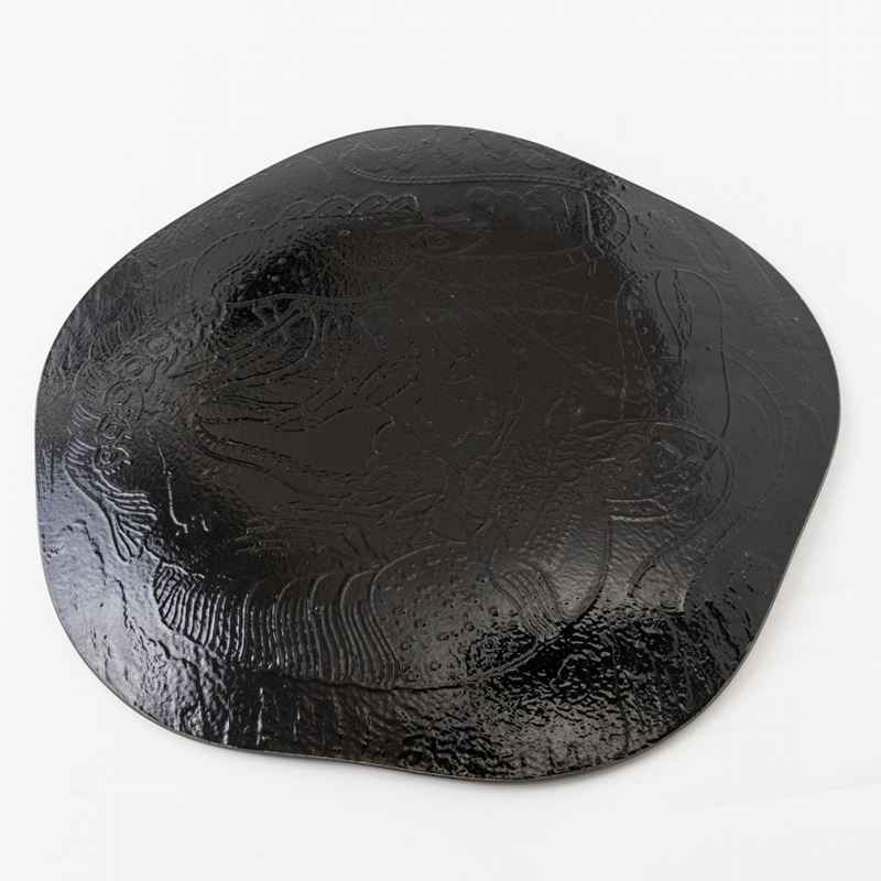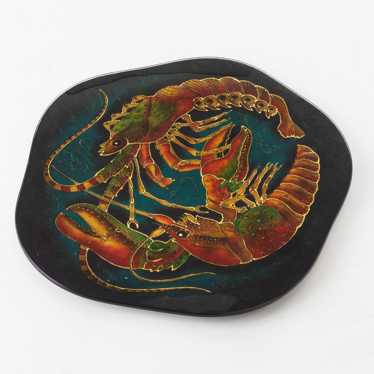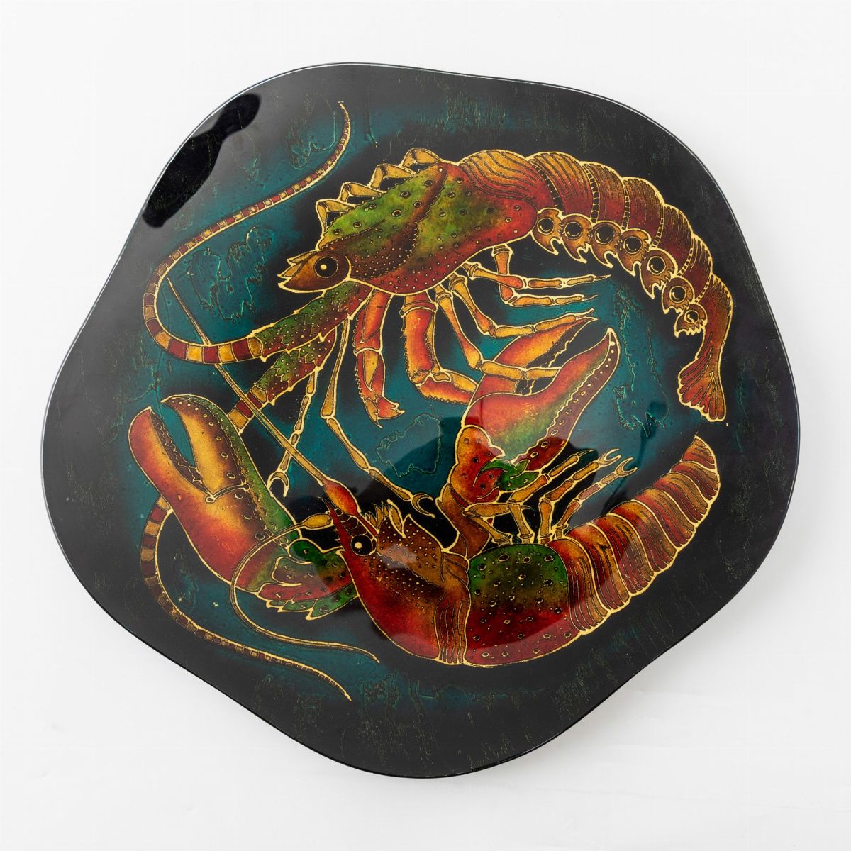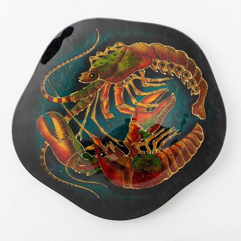 Piatto polilobato in cristallo con decoro fixée di astici in policromia e dorature.