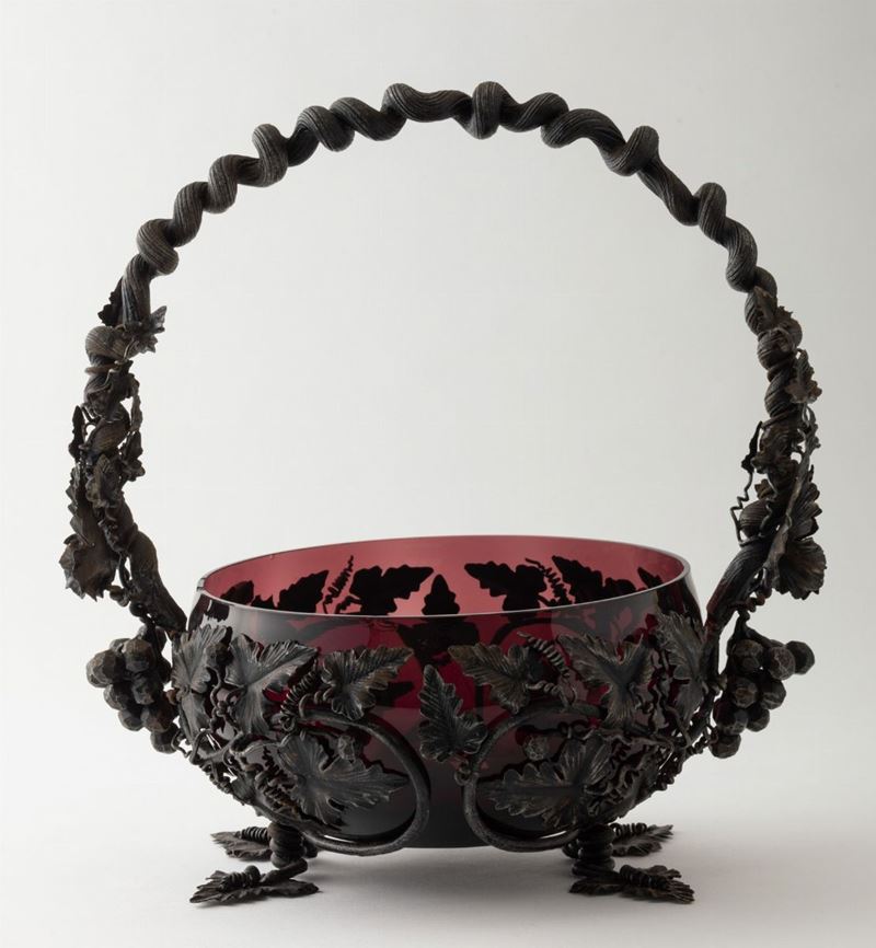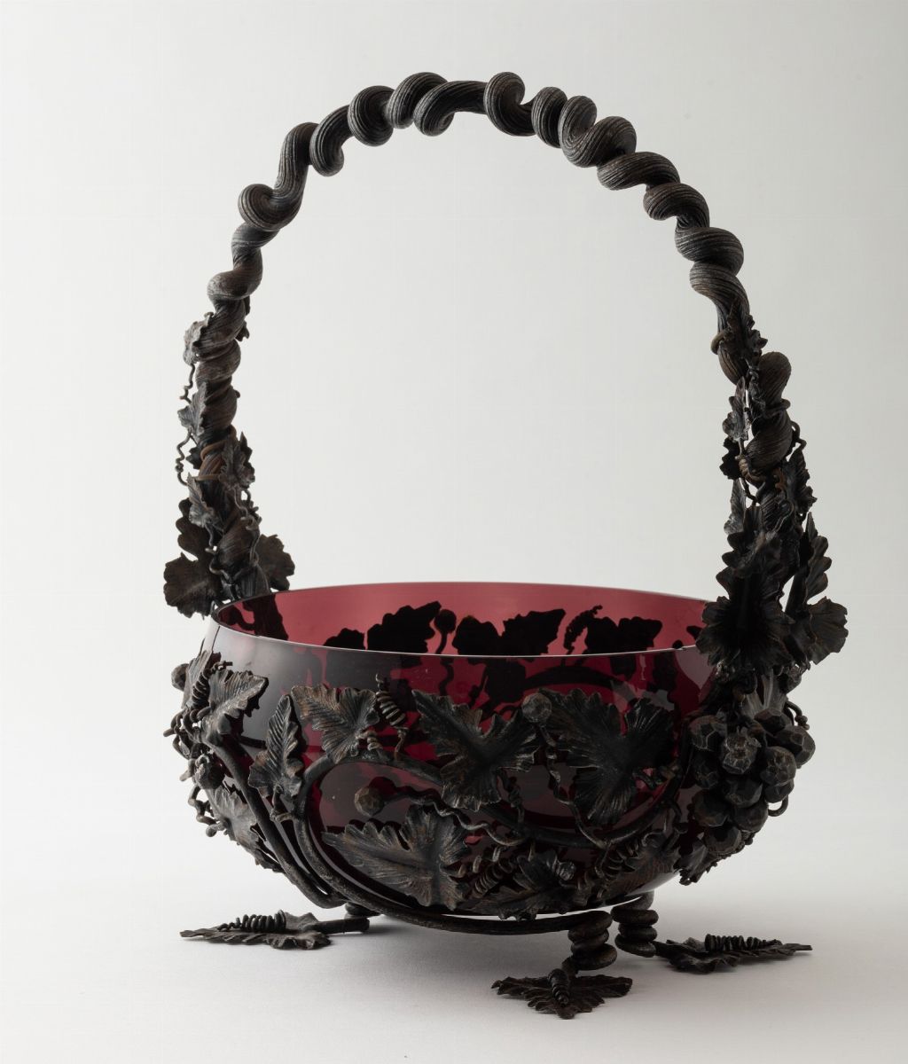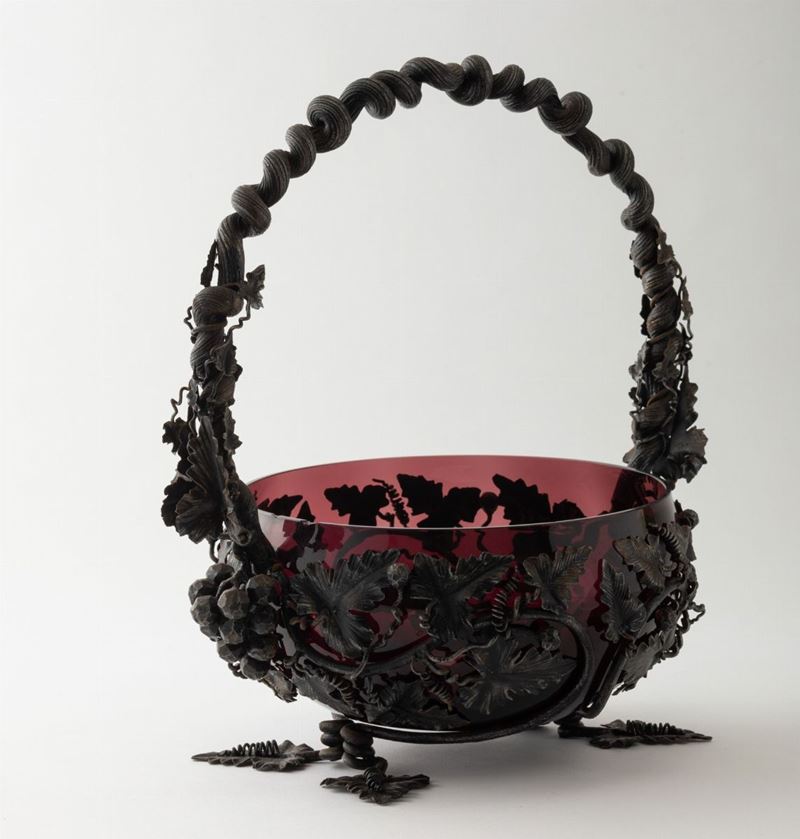 Centrotavola in forma di cesto con manico in ferro con decoro di pampini e uva, contenente coppa in vetro soffiato ciclamino.