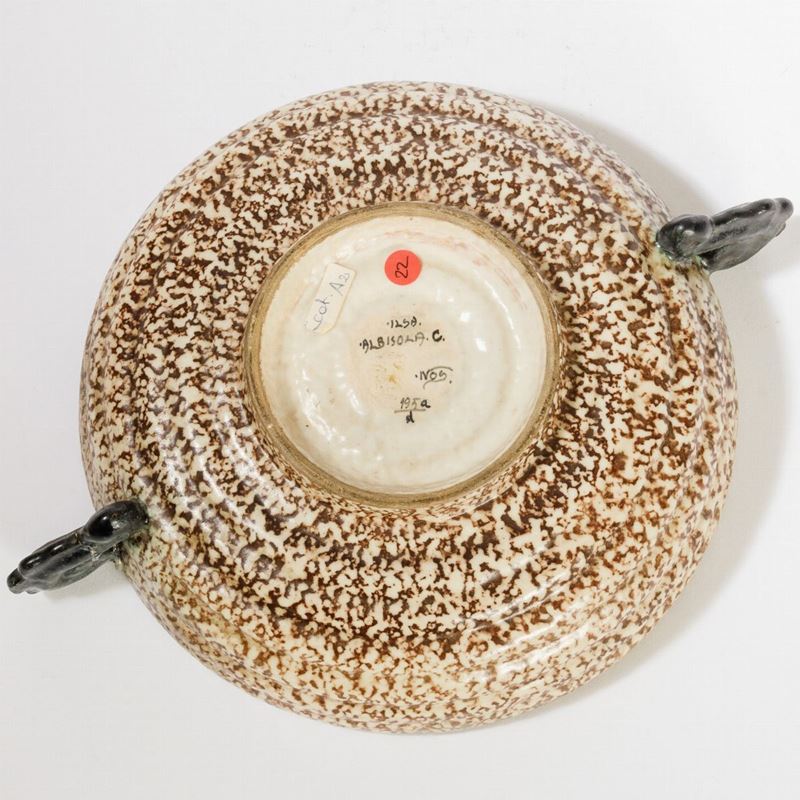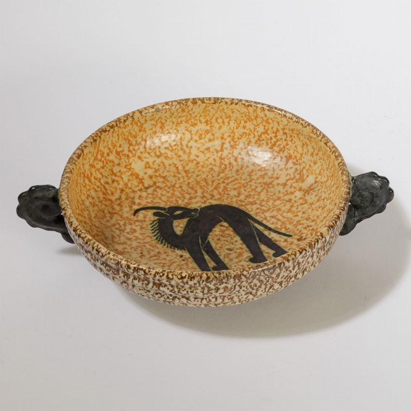 Coppa in ceramica con anse a conchiglia e decoro di antilope sul fondo a smalti policromi.