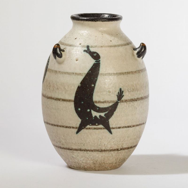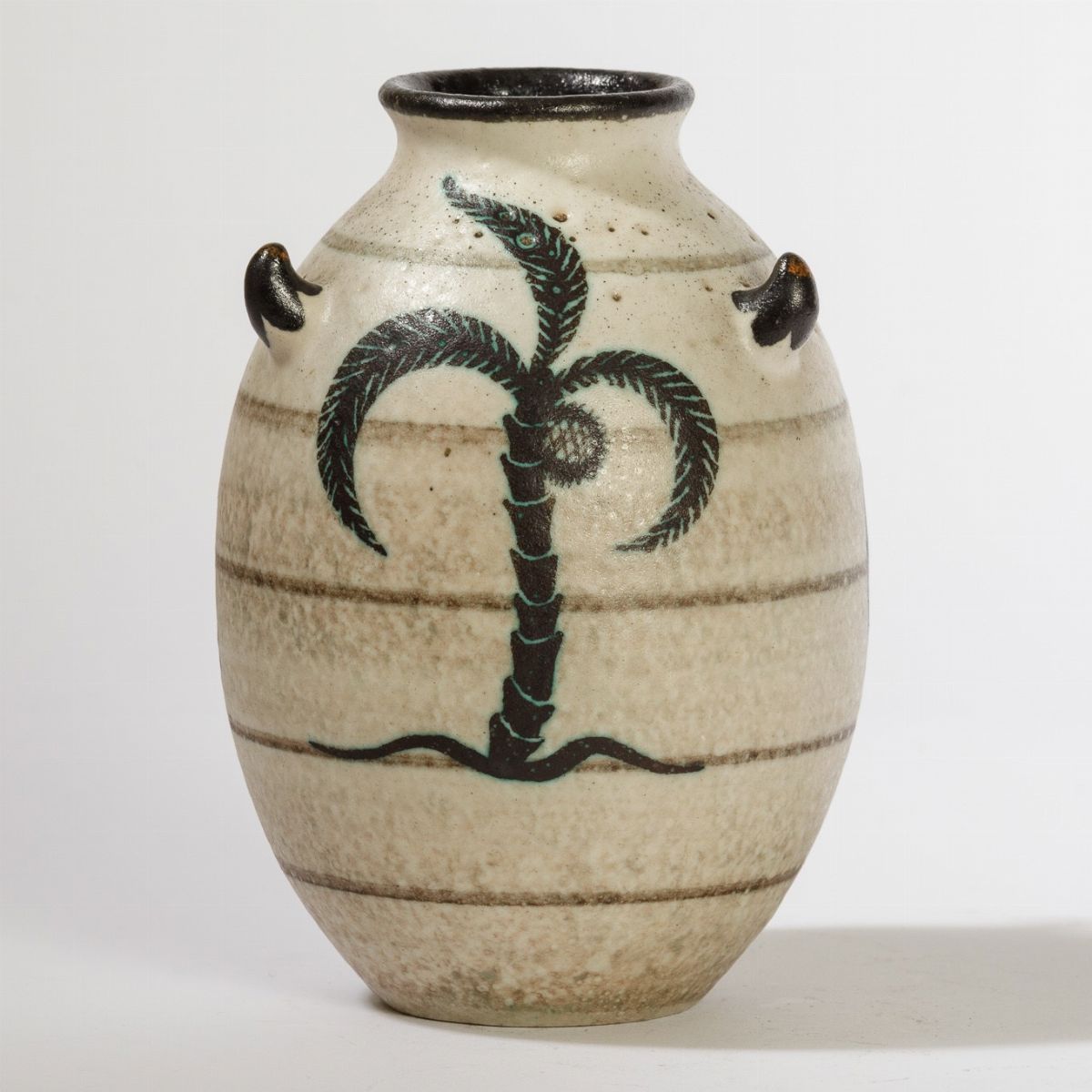 Vaso ad orcio con corni applicati in ceramica con decoro di animali e palma a smalti policromi su fondo a fasce.