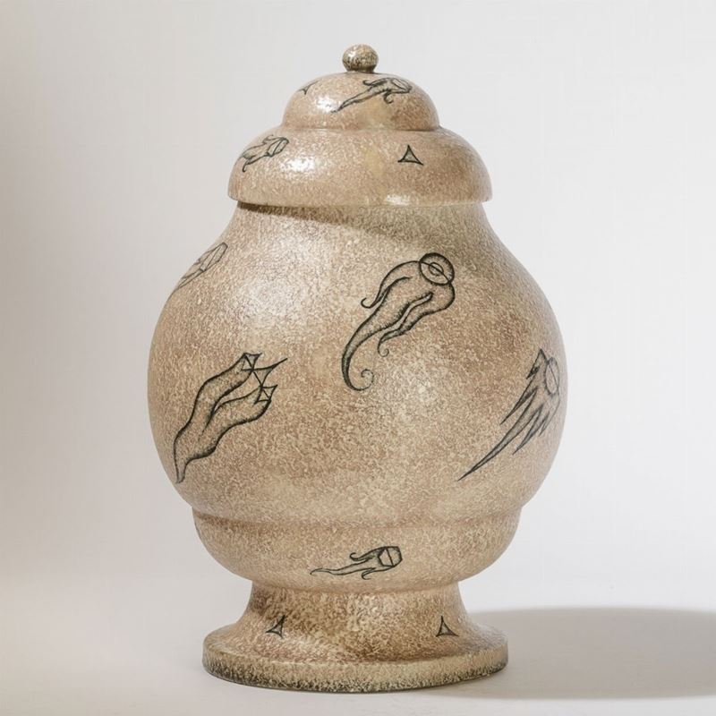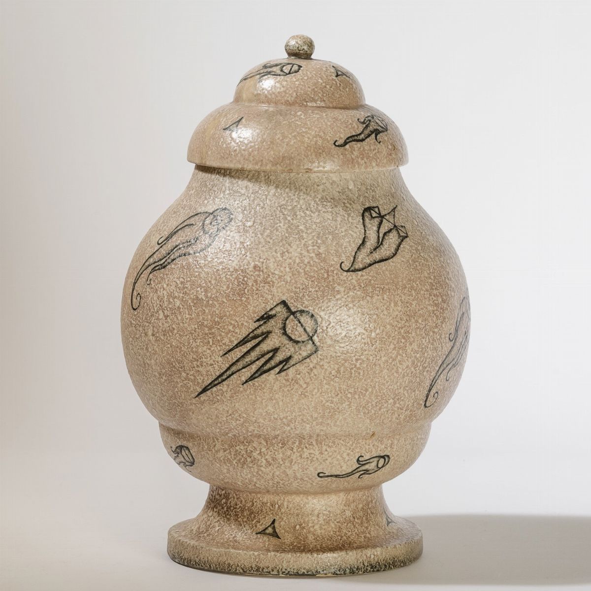 Vaso bombato con coperchio su piede a campana in ceramica con decoro futurista di figure astratte.