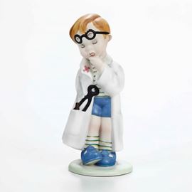 Figura di giovane dottore in terraglia a colaggio con decoro di smalti policromi.