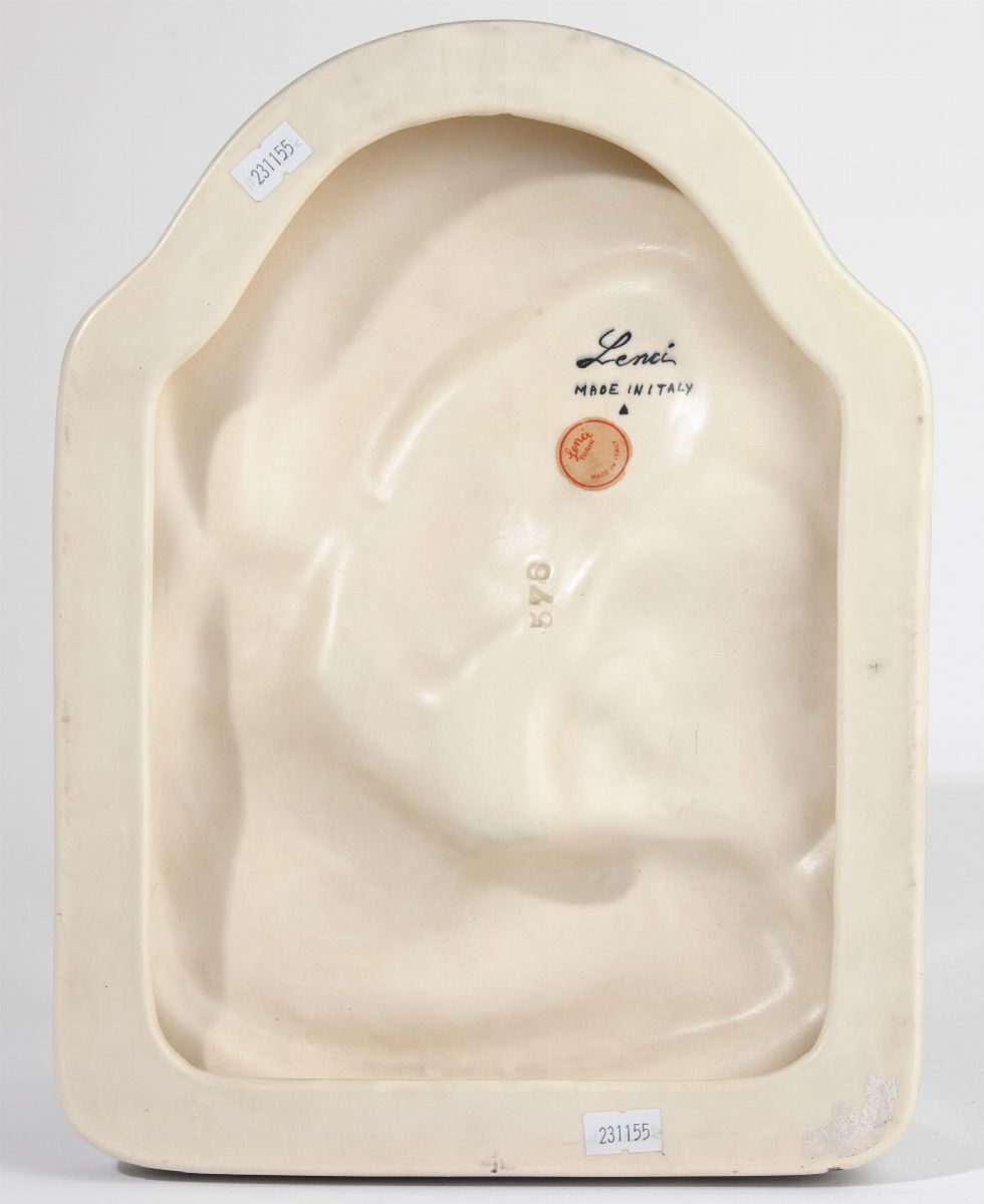 Bassorilievo raffigurante madonna con bambino in terraglia a colaggio con decoro policromo.