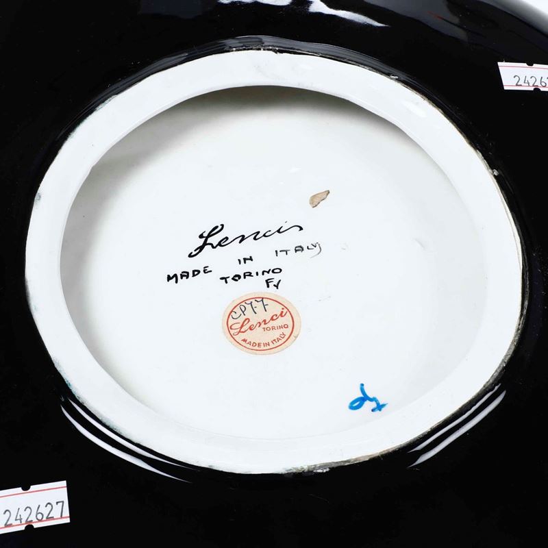 Centrotavola in forma di foglia con decoro di profilo a rilievo in terraglia smaltata nera.