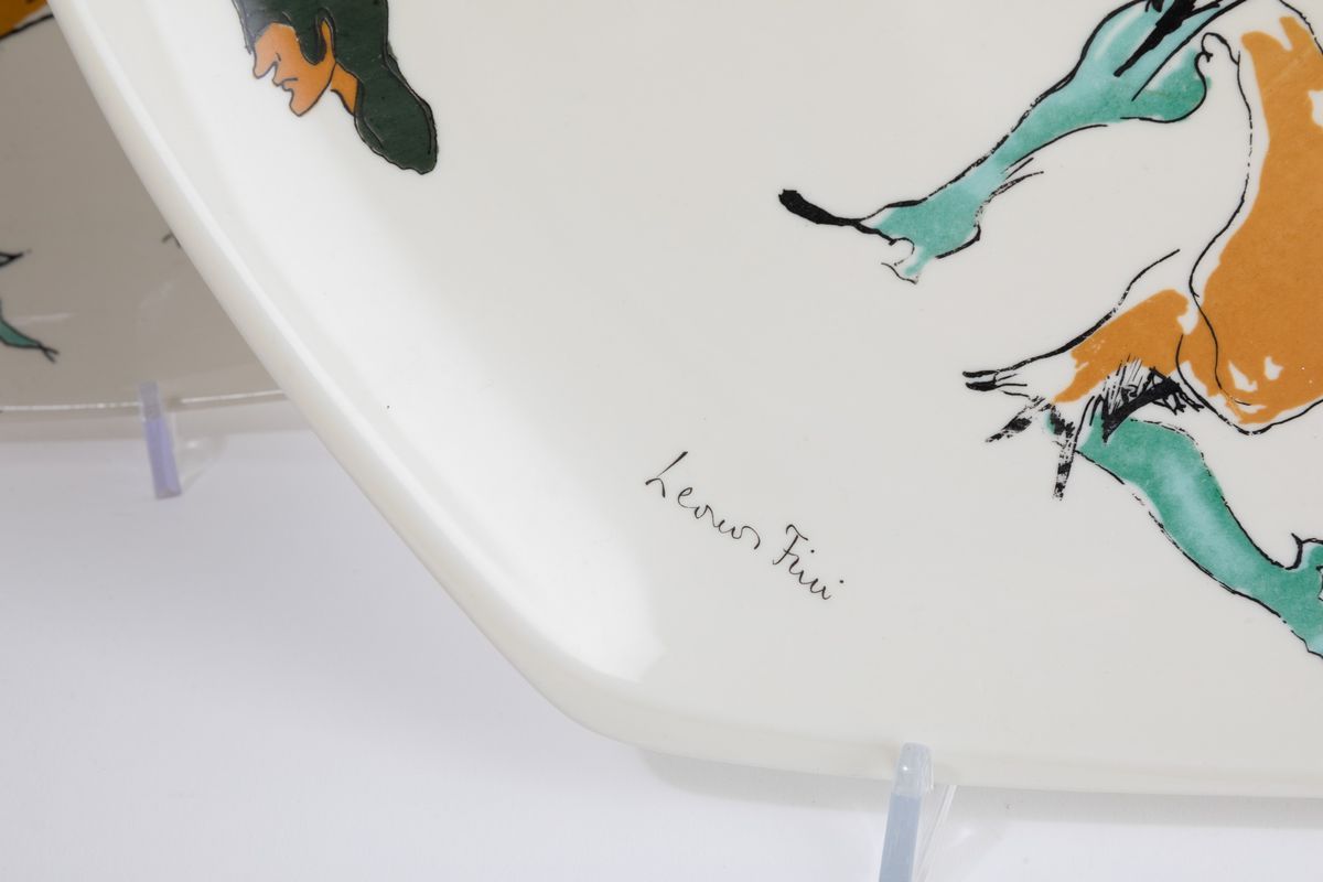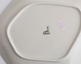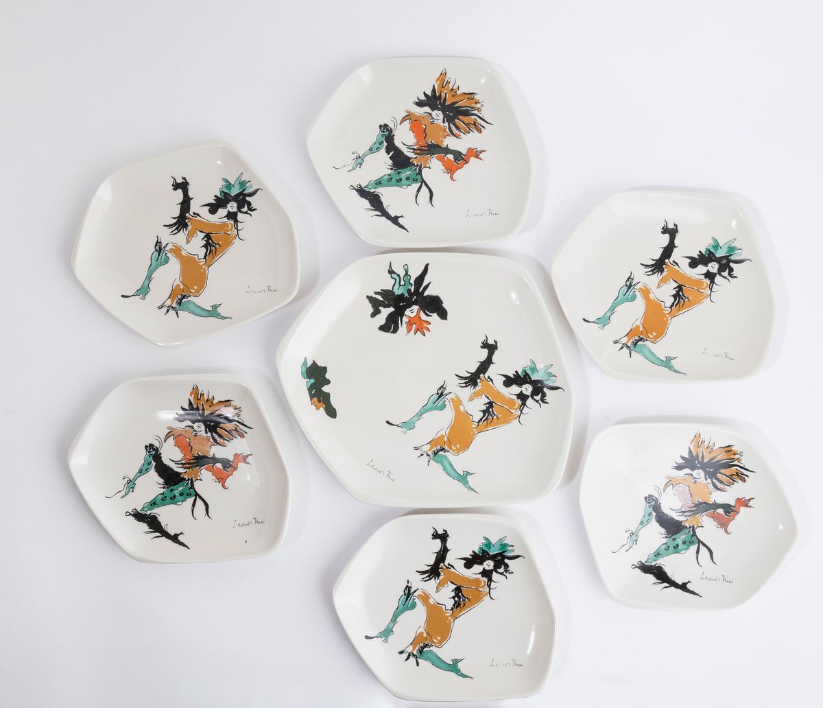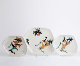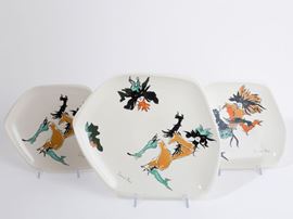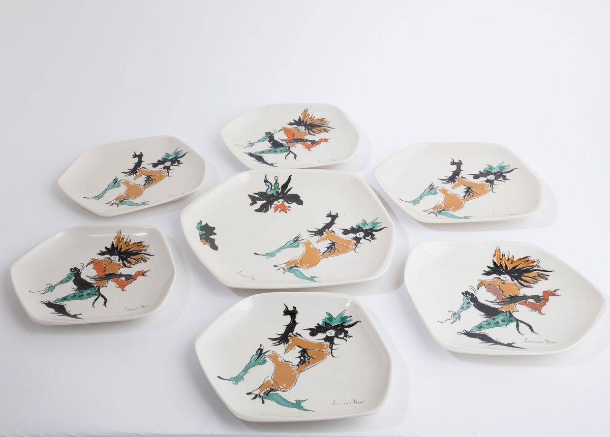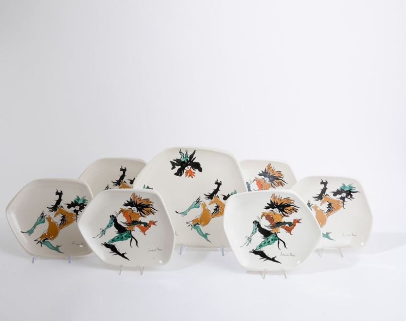 Set di 6 piatti ed uno più grande in terraglia a colaggio di forma poligonale con decoro di figure dipinte.