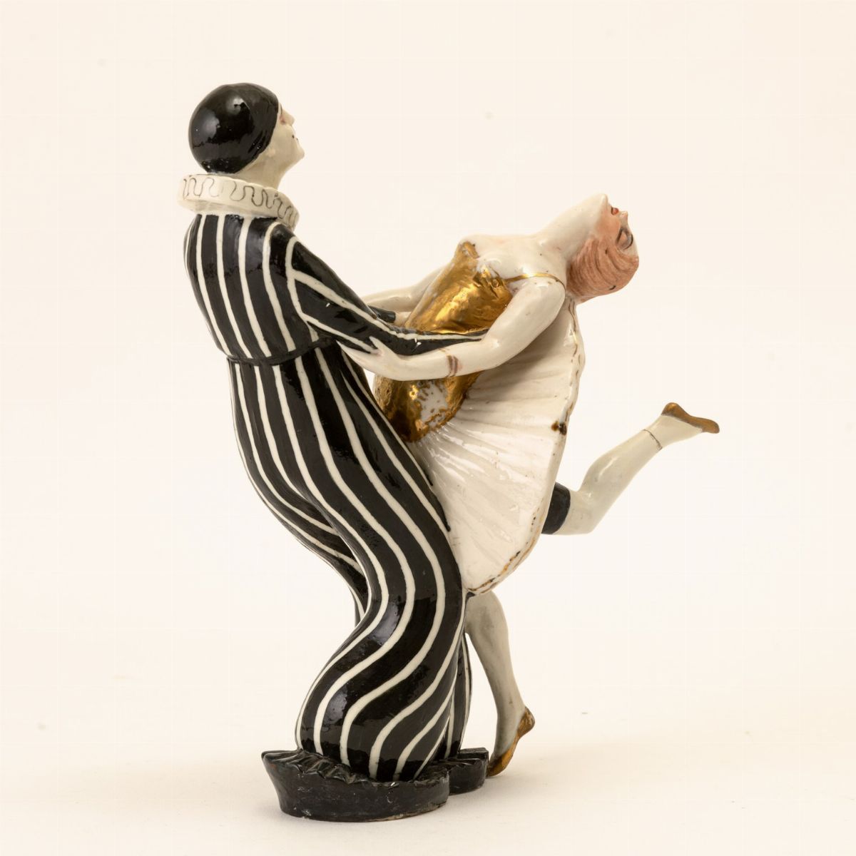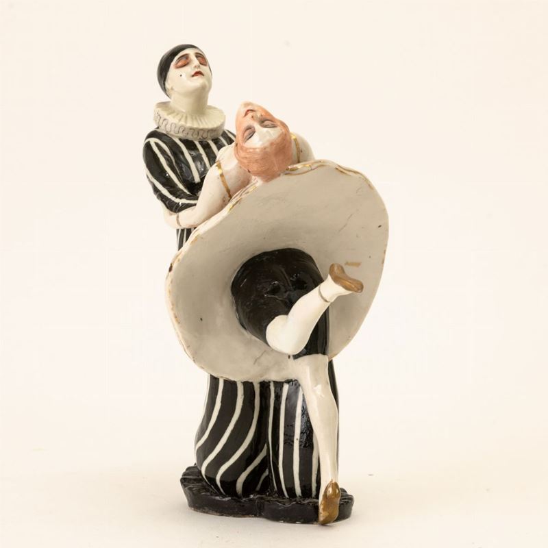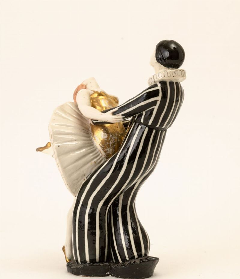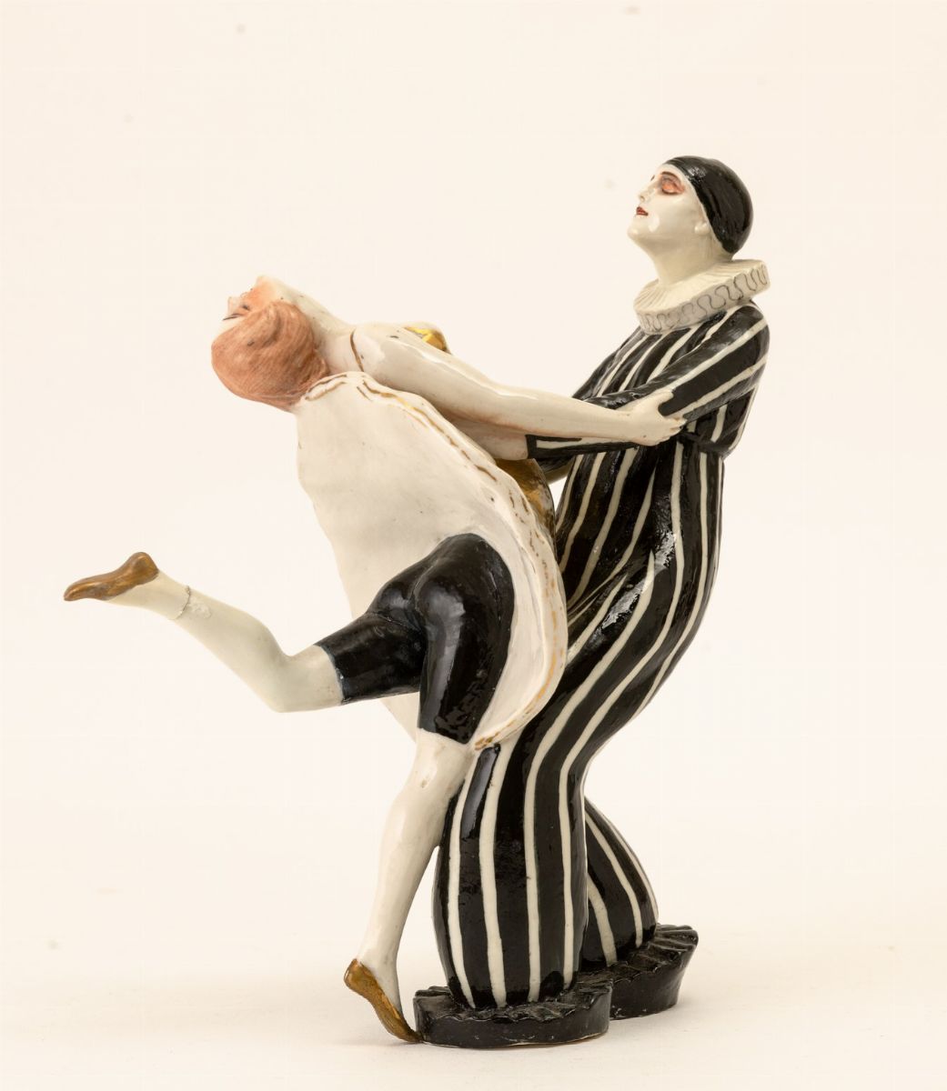 Gruppo in porcellana raffigurante Pierrot con danzatrice.