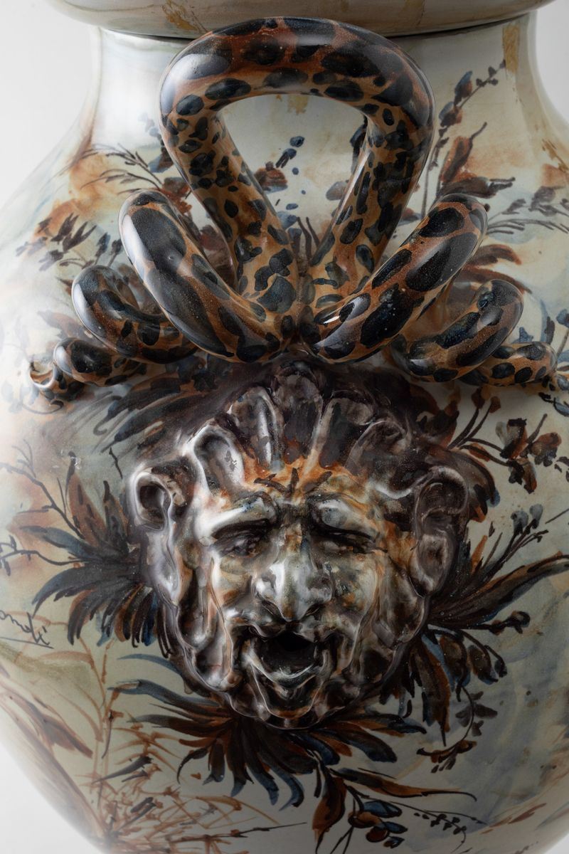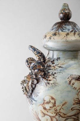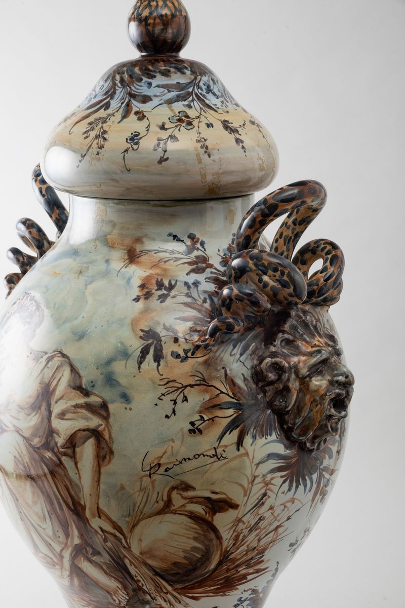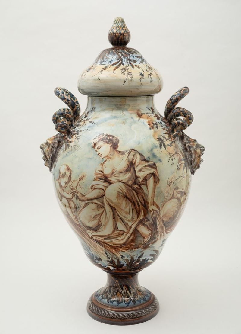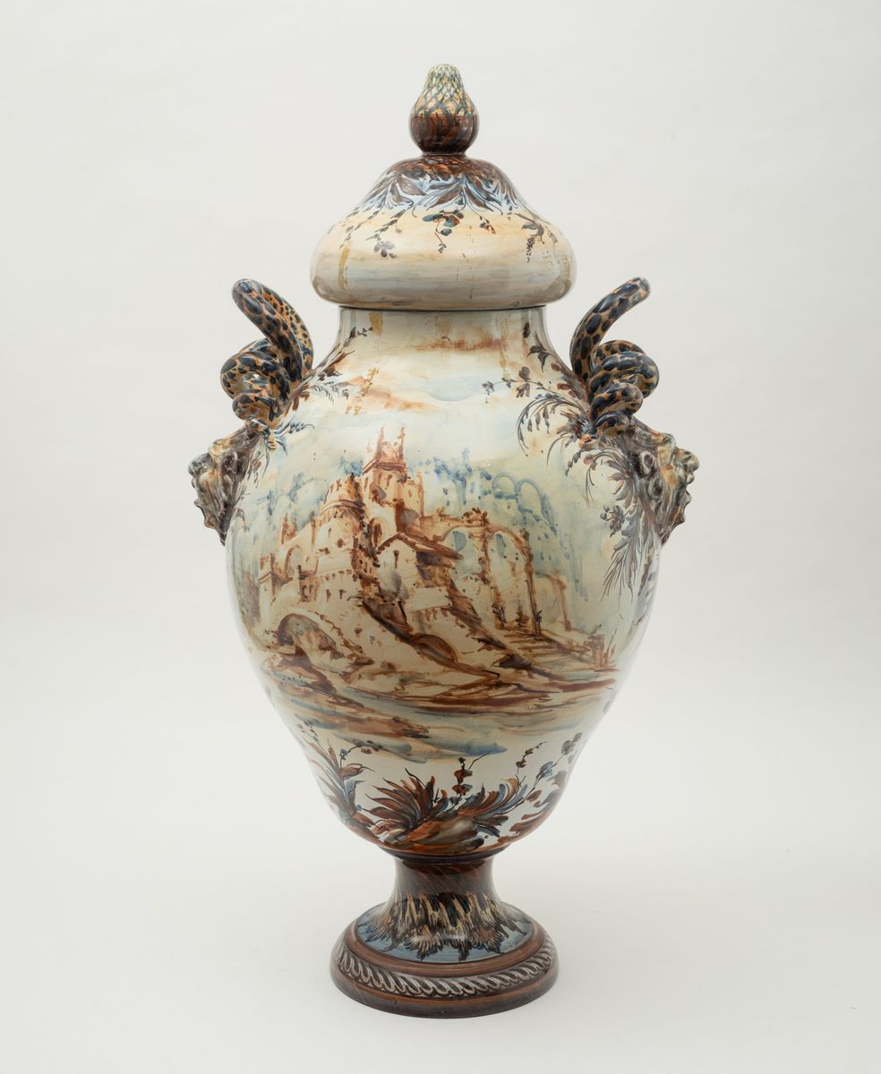 Grande vaso con coperchio in terracotta maiolicata ad anse serpentiformi con decoro in policromia di paesaggi e figura con anfora