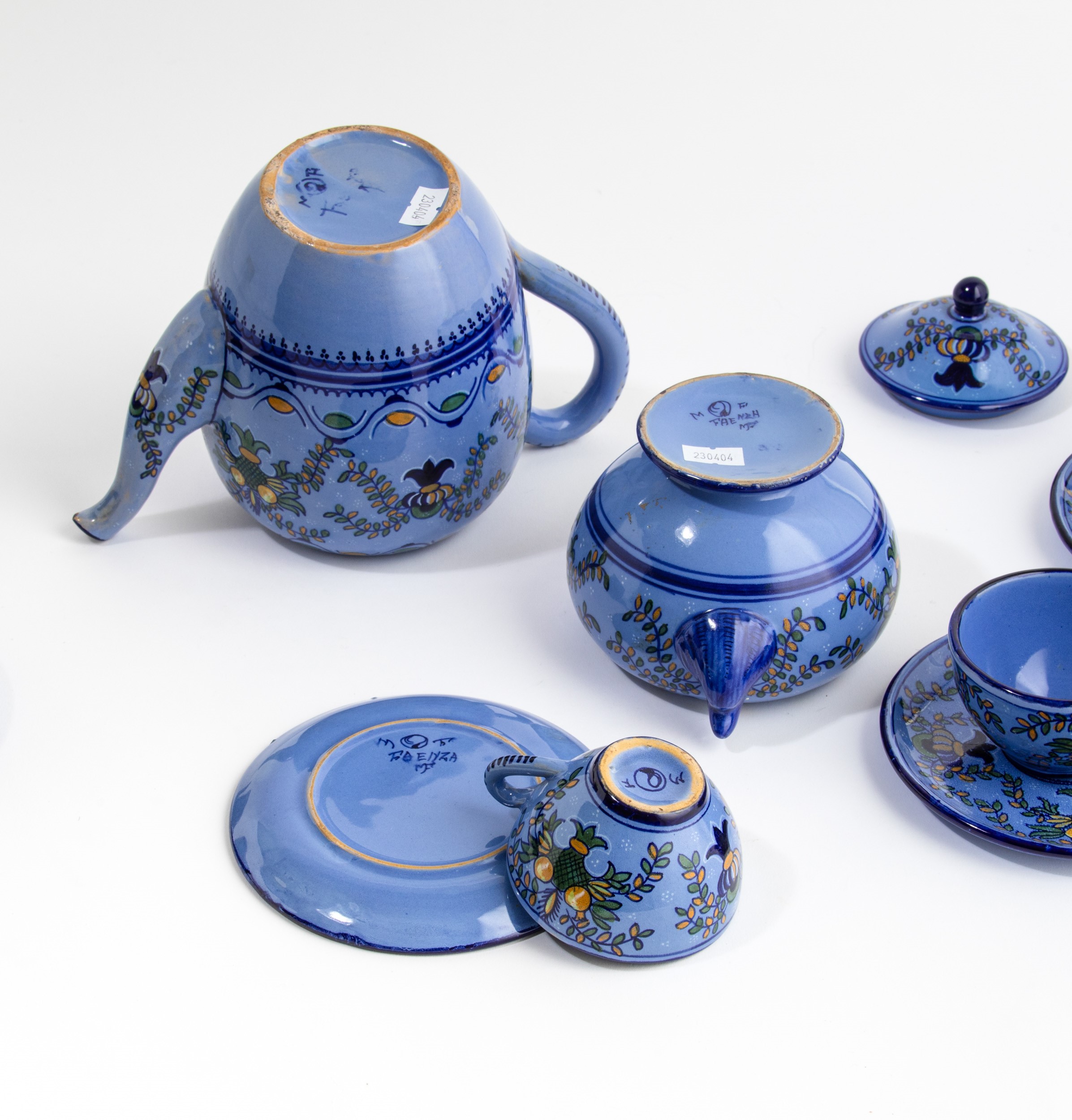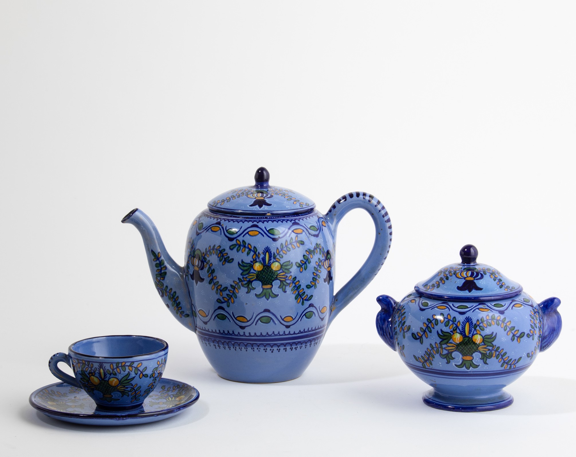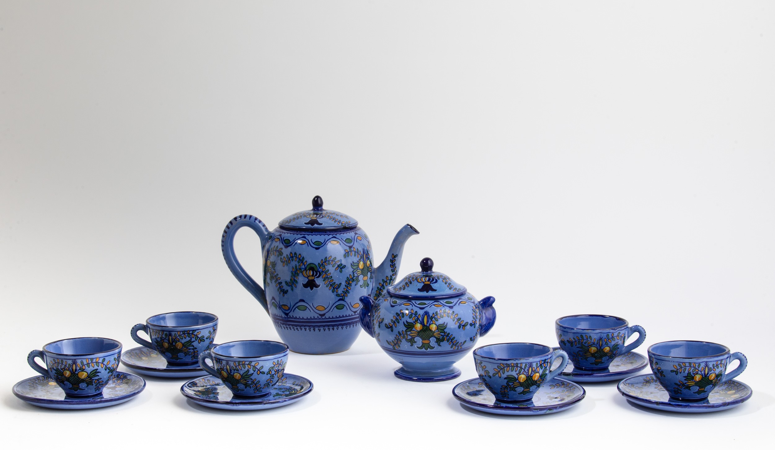 Servizio da the in maiolica composto da teiera, zuccheriera,sei tazzine con relativi piattini, decoro policromo a smalti.