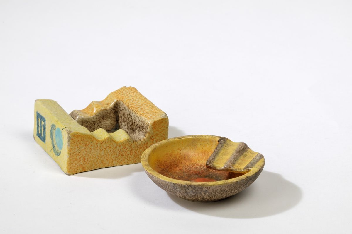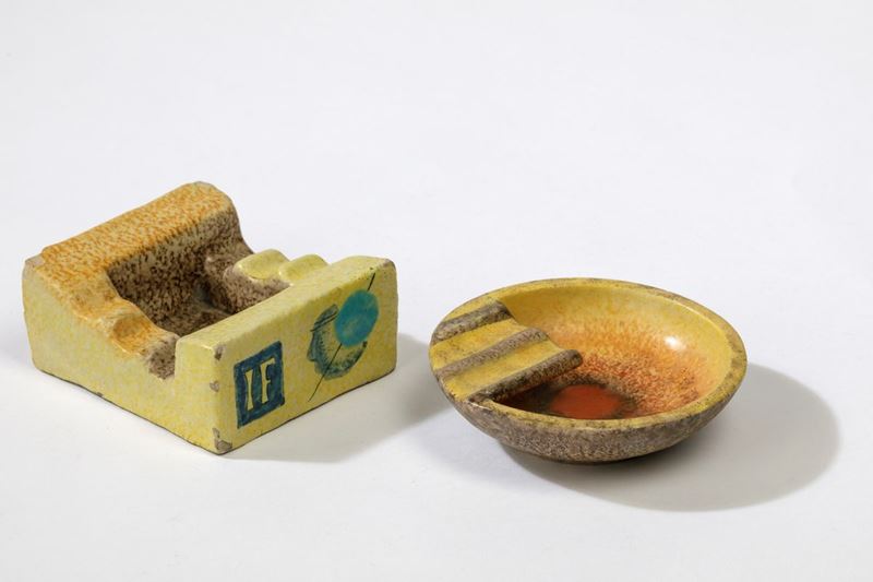 Due posaceneri in terraglia a colaggio con decoro futurista.