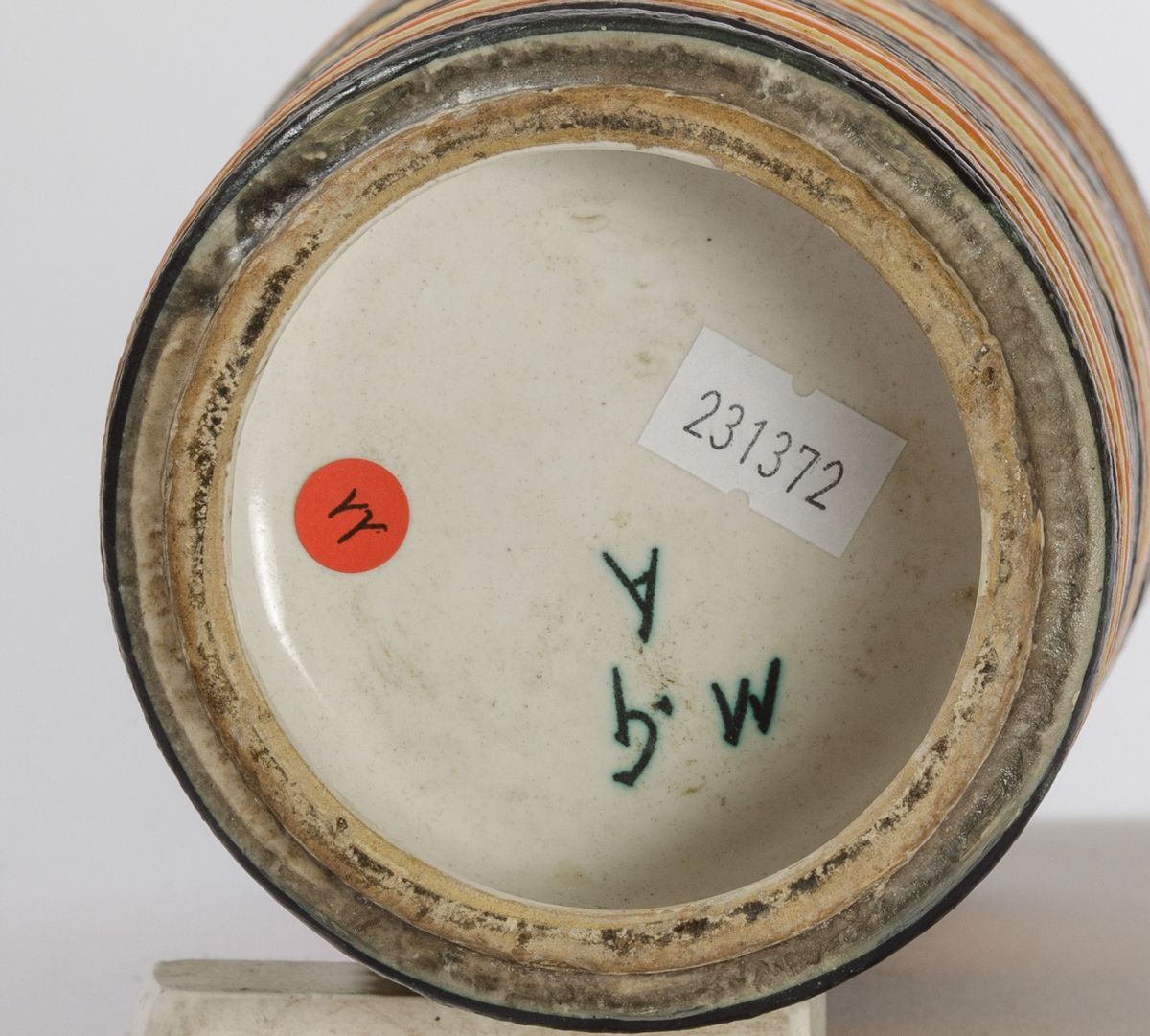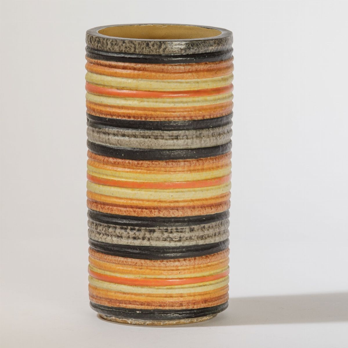 Vaso cilindrico in ceramica con decoro di fasce a rilievo a smalti policromi.