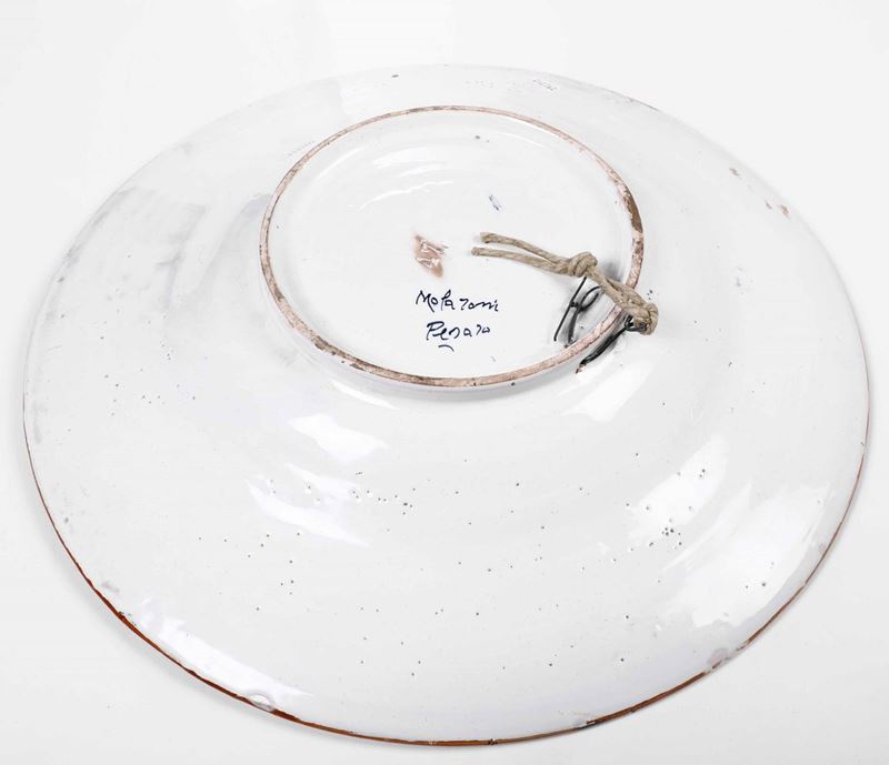 Grande piatto con centro concavo in terracotta maiolicata raffigurante busto di donna con elmo in cornice a decoro rinascimentale.
