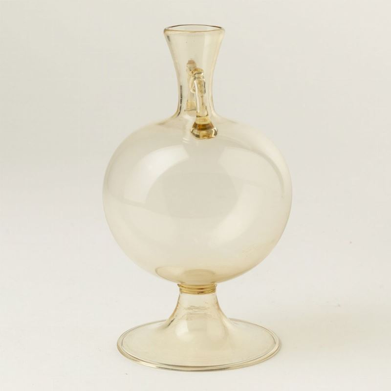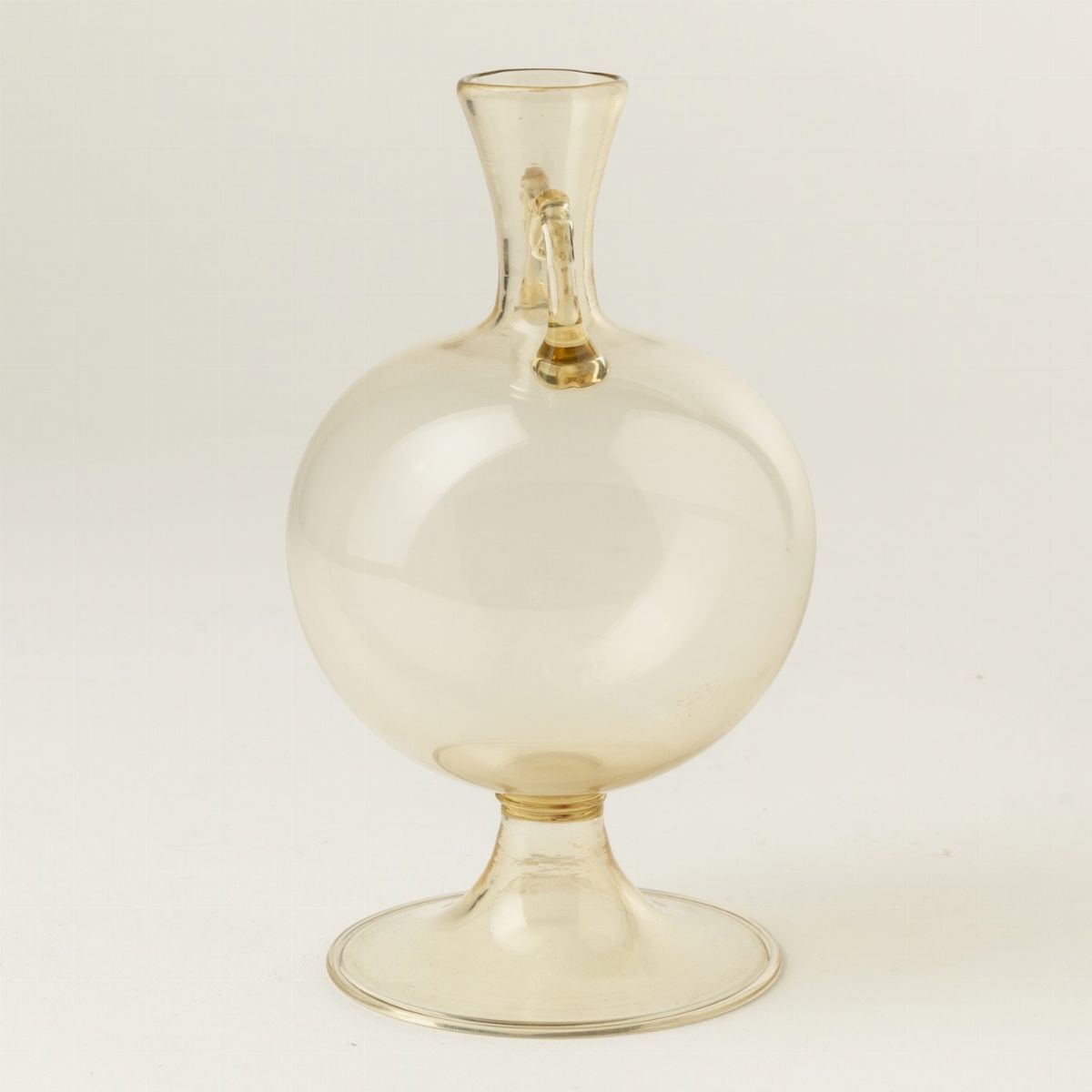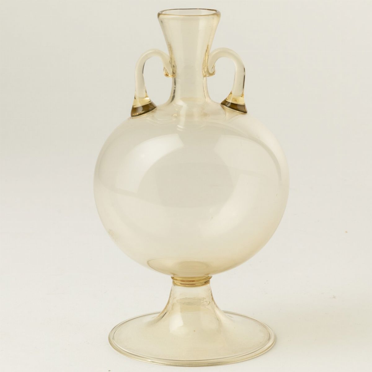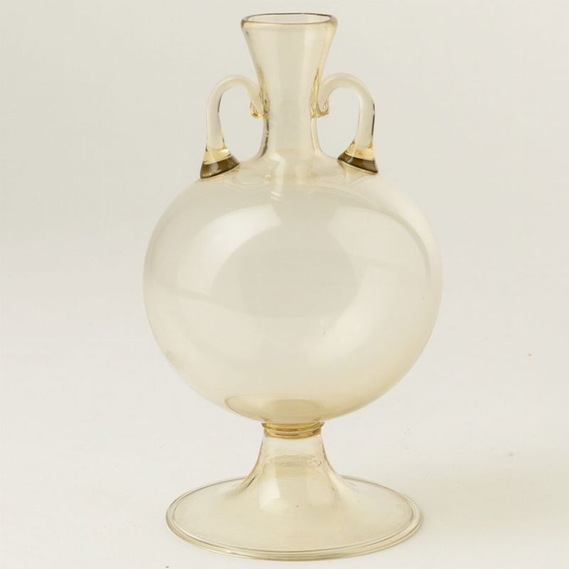 Vaso a sfera su alto piede a tromba con anse applicate in vetro soffiato paglierino.