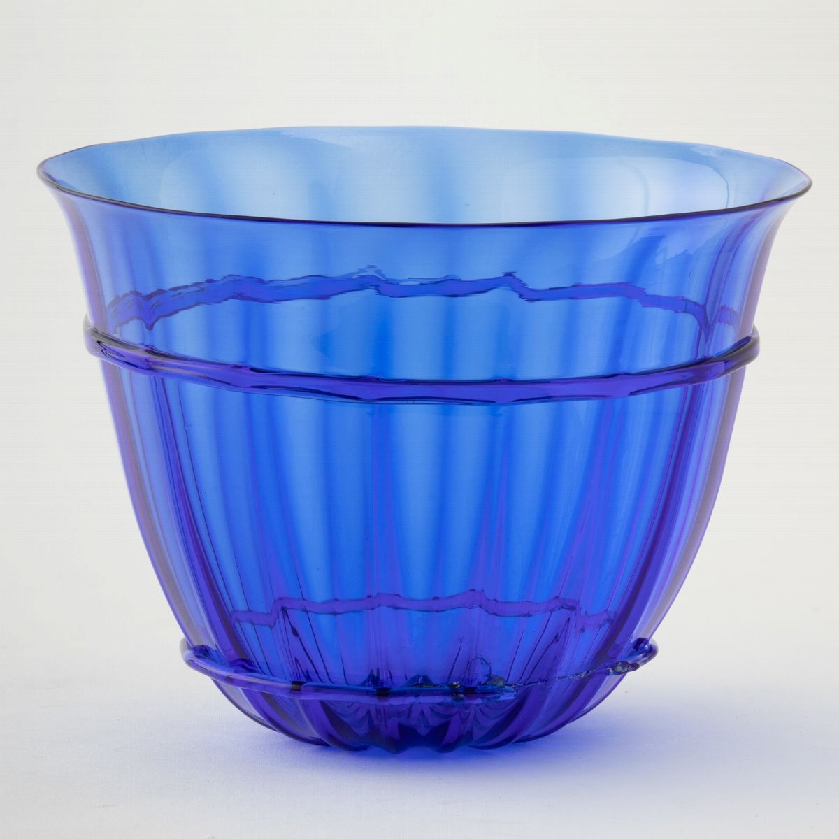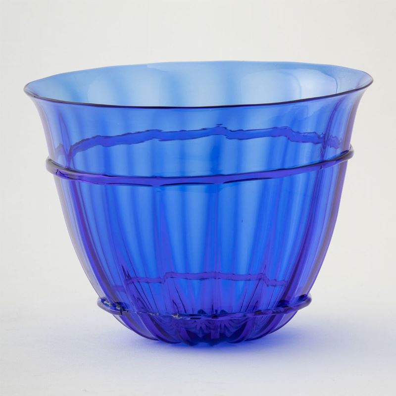Coppa in vetro costolato blu con applicazione ad anello.