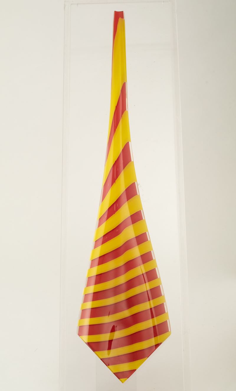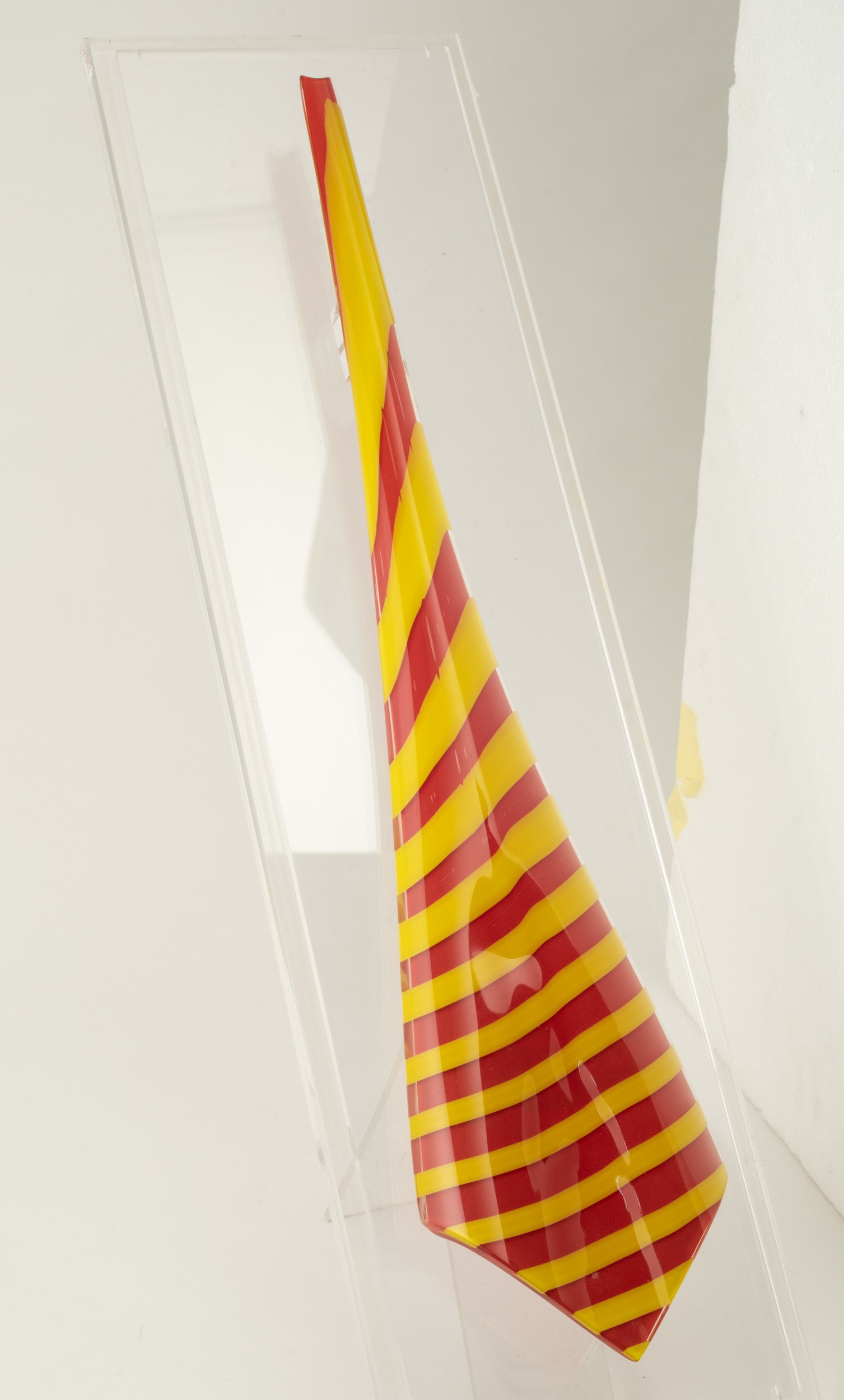 Cravatta in vetro sommerso di Murano con decoro di canne policrome entro teca in plexiglas.