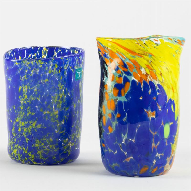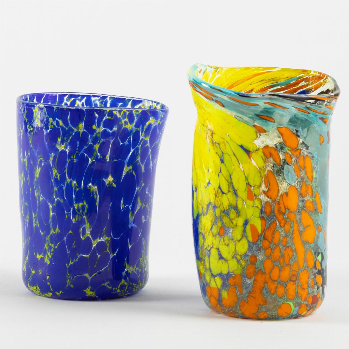 Due goti da fornasa in vetro soffiato con decoro di polveri policrome.