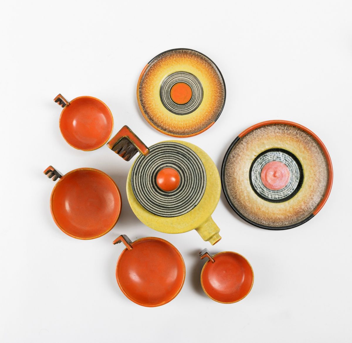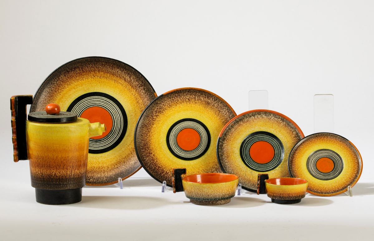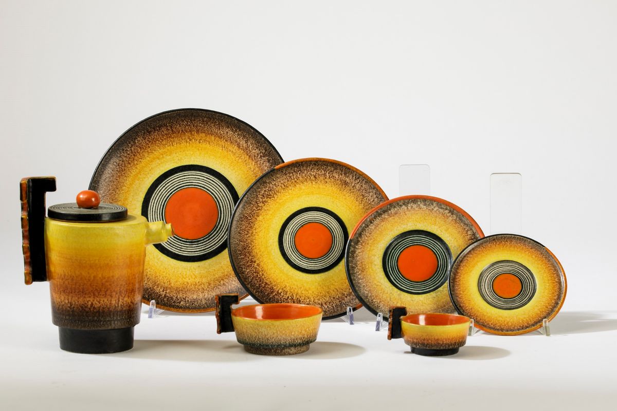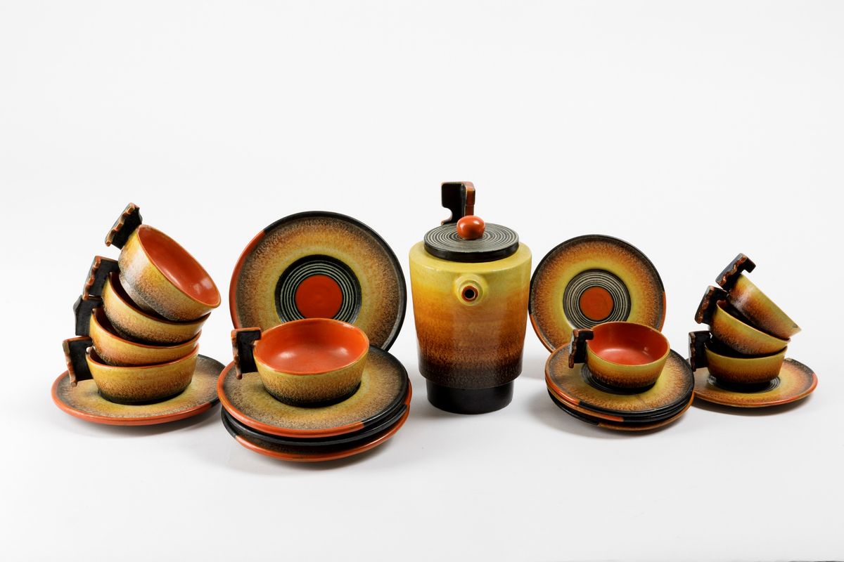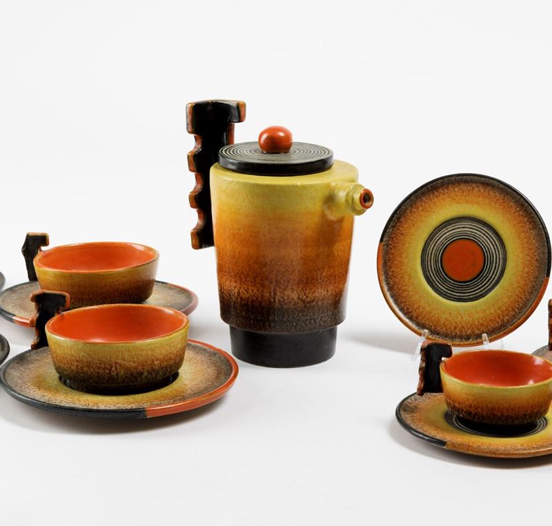 Servizio in terraglia a colaggio con decoro futurista composto da teiera, 5 tazze da the, 4 da caffè con relativi piattini, 10 piatti da dolce e uno da portata.