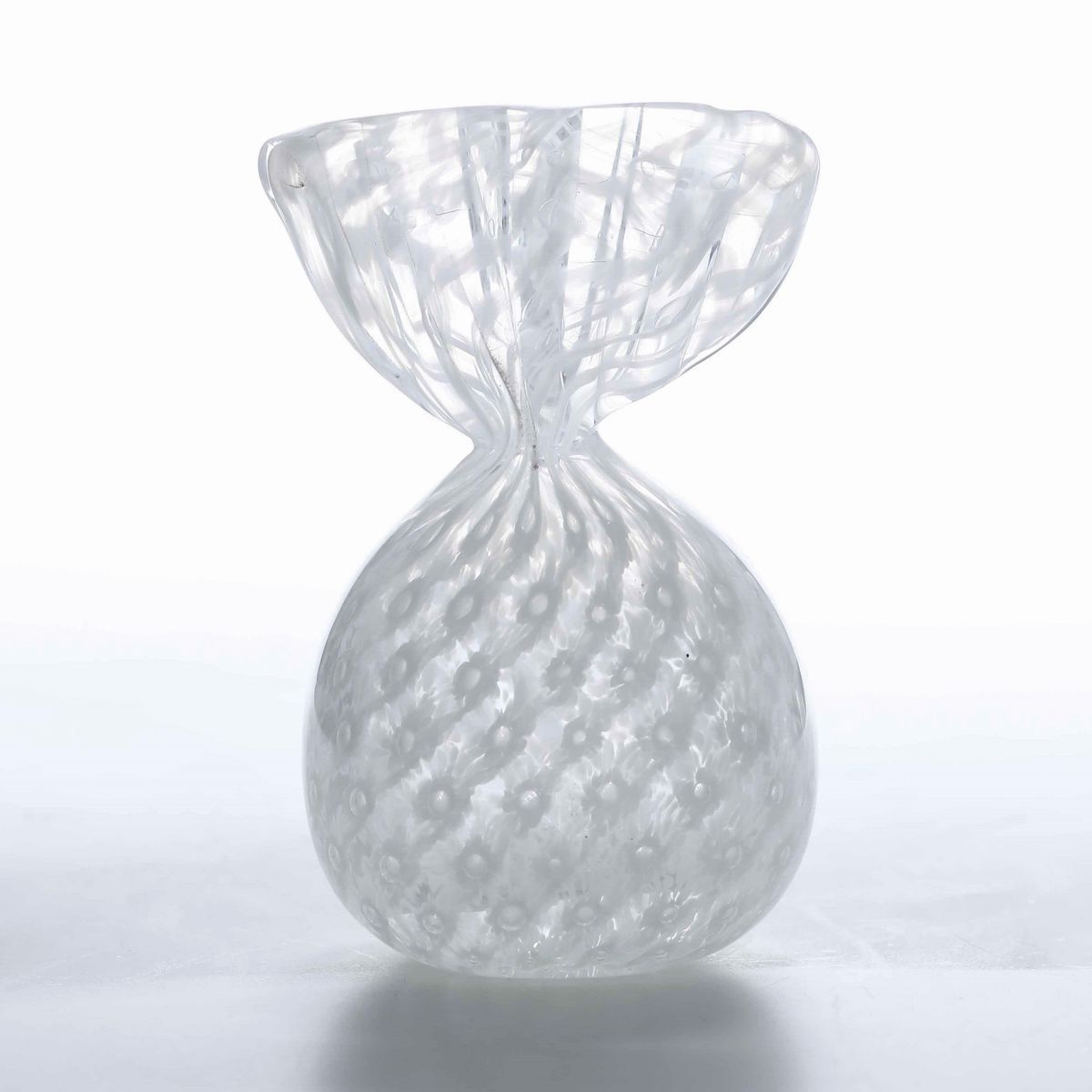 Vaso in vetro soffiato con decoro intercalare in vetro lattimo e murrine.