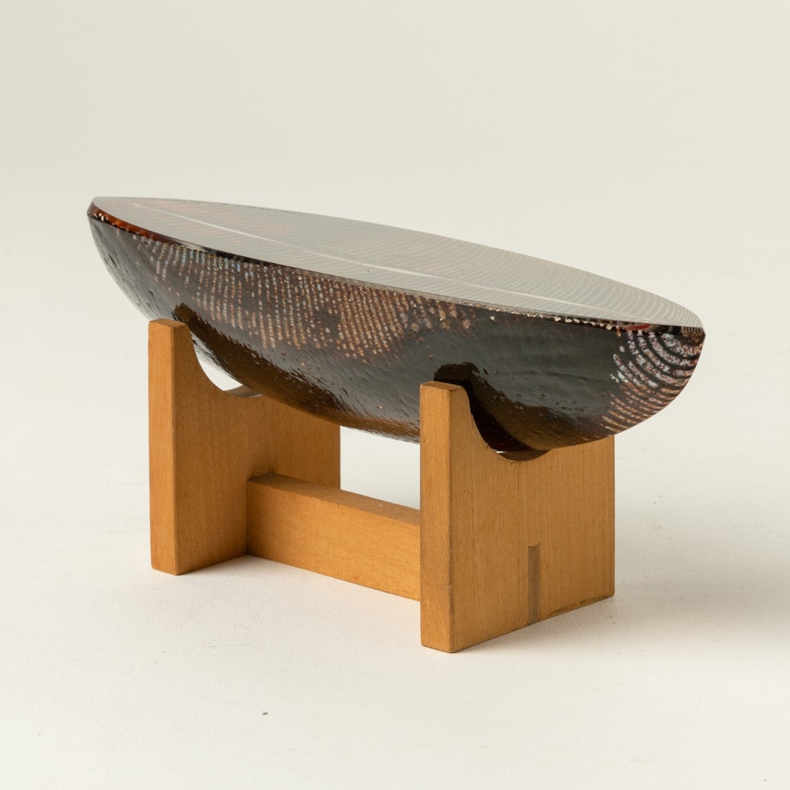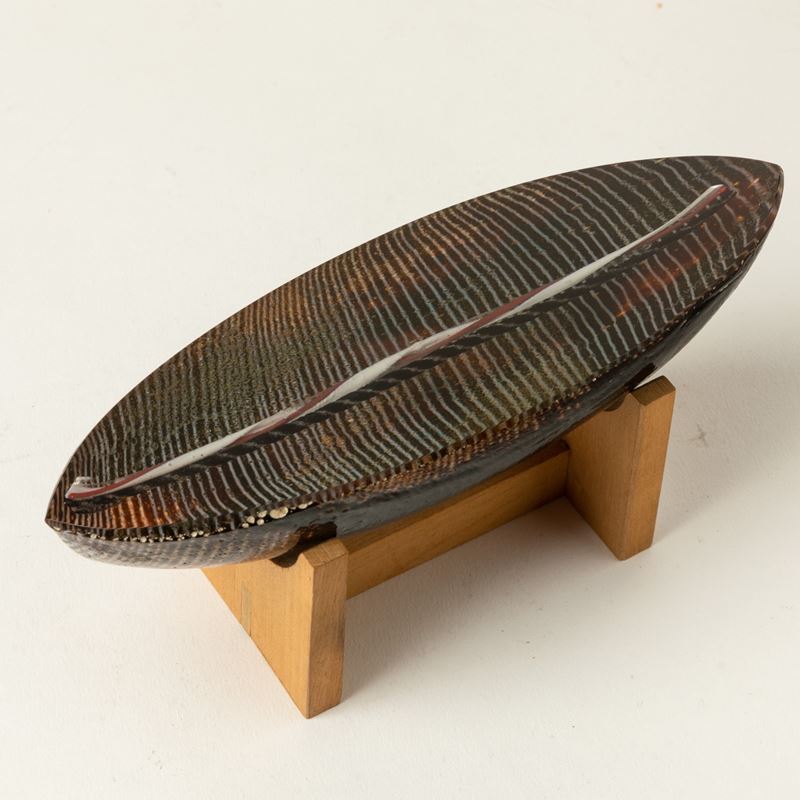 Soprammobile in forma di canoa in vetro pesante con decoro di canne policrome e polveri sommerse.
