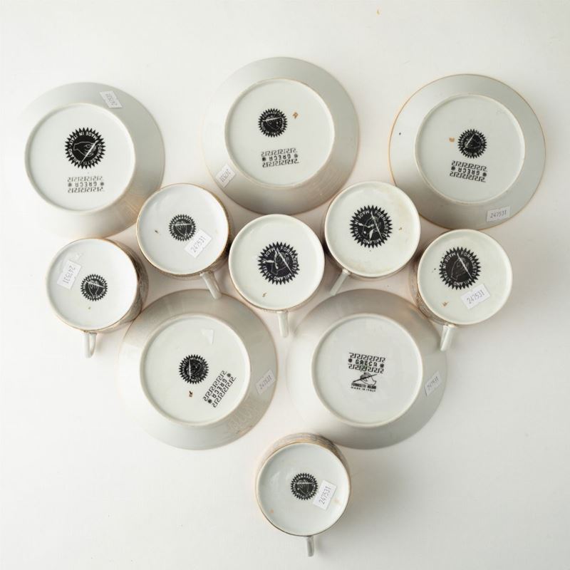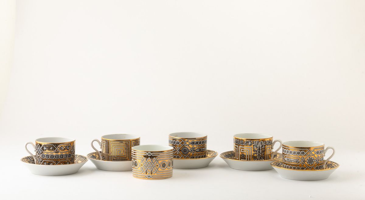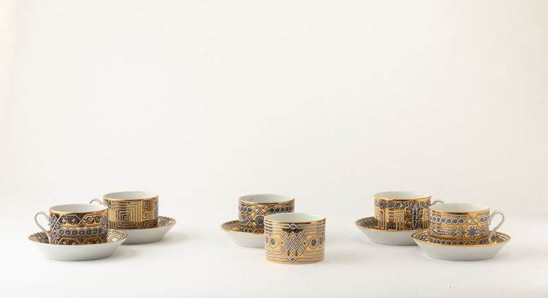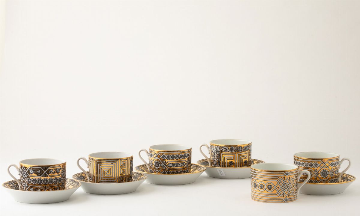 Lotto formato da sei tazze da the e cinque piattini in porcellana con decoro serigrafato e oro modello Greca. Marchio della manifattura